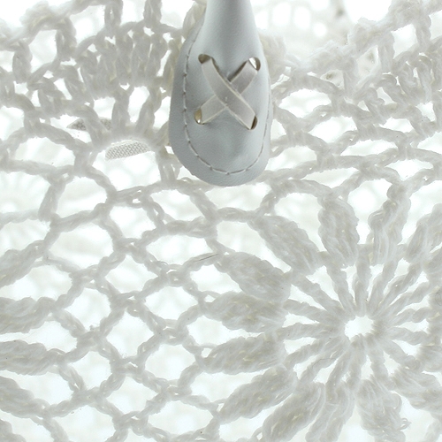 La borsa all'uncinetto con manico in bianco ha una lunghezza di circa 48 centimetri, una larghezza di circa 33 centimetri e un'altezza di circa 30 centimetri.