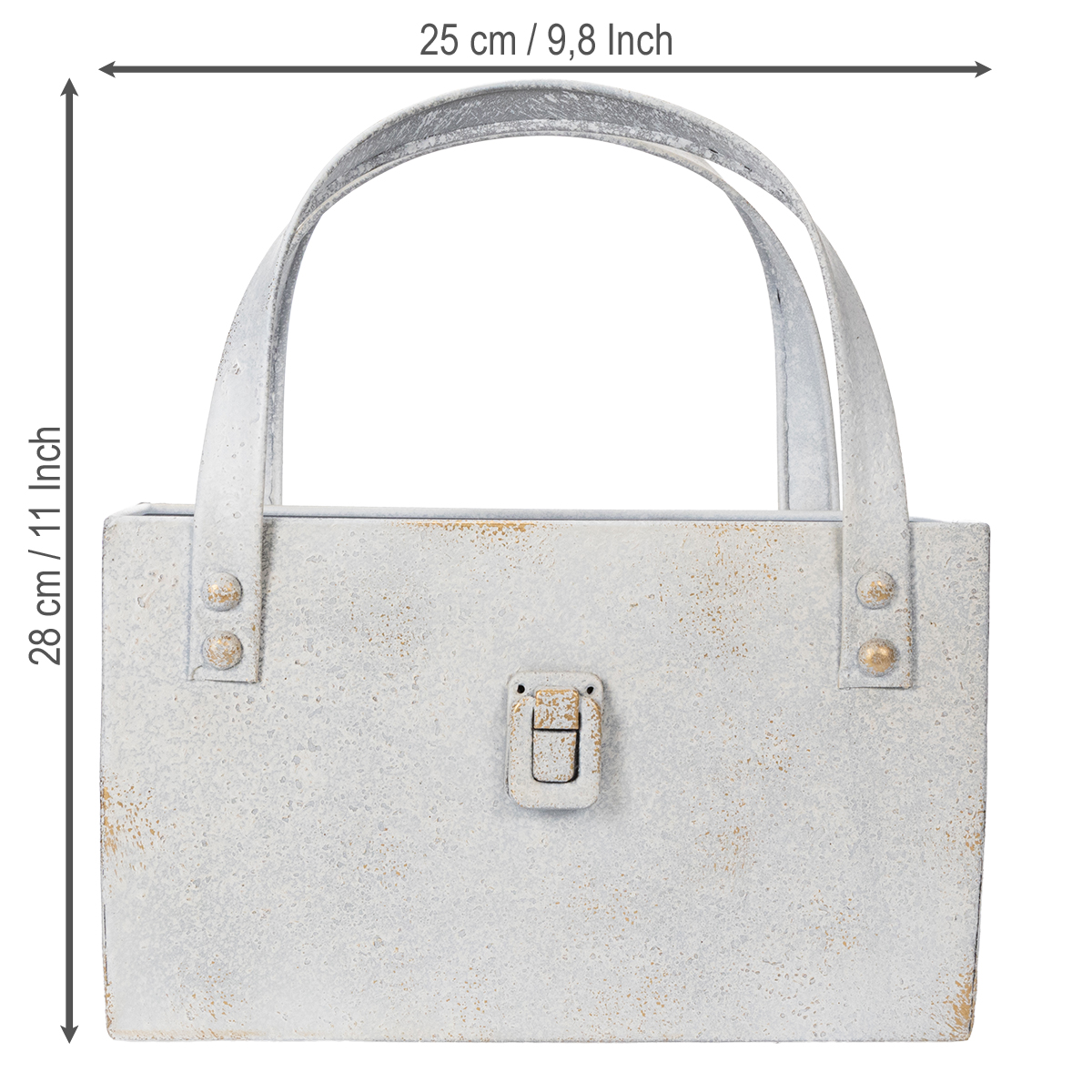 Questa borsa in metallo combina un design moderno con un fascino rustico e senza tempo. Il robusto manico non solo la rende facile da trasportare, ma è anche un vero e proprio elemento di design. La finitura leggermente anticata in stile vintage aggiunge un tocco particolarmente elegante e si fonde perfettamente con una varietà di stili di interior design, dal country all'industrial. Vuoi usare questa borsa decorativa in metallo come fioriera? Nessun problema! È ideale per esporre con stile piccole composizioni floreali o piante grasse. Anche accenti stagionali, come decorazioni autunnali con zucche o una composizione natalizia piena di rami di abete, stanno benissimo in questa borsa. Altrettanto pratico: usa la borsa come organizer per attrezzi da giardinaggio come forbici o guanti. In questo modo tutto rimane a portata di mano e ha un aspetto gradevole. Il colore grigio neutro opaco si adatta a quasi ogni ambiente e si armonizza meravigliosamente con altri elementi decorativi. Ad esempio, abbina la borsa in metallo ai nostri semplici vasi in vetro o alle rustiche ciotole in legno di Floristik24 per creare ancora più armonia nel tuo arredamento. Un vero tuttofare!