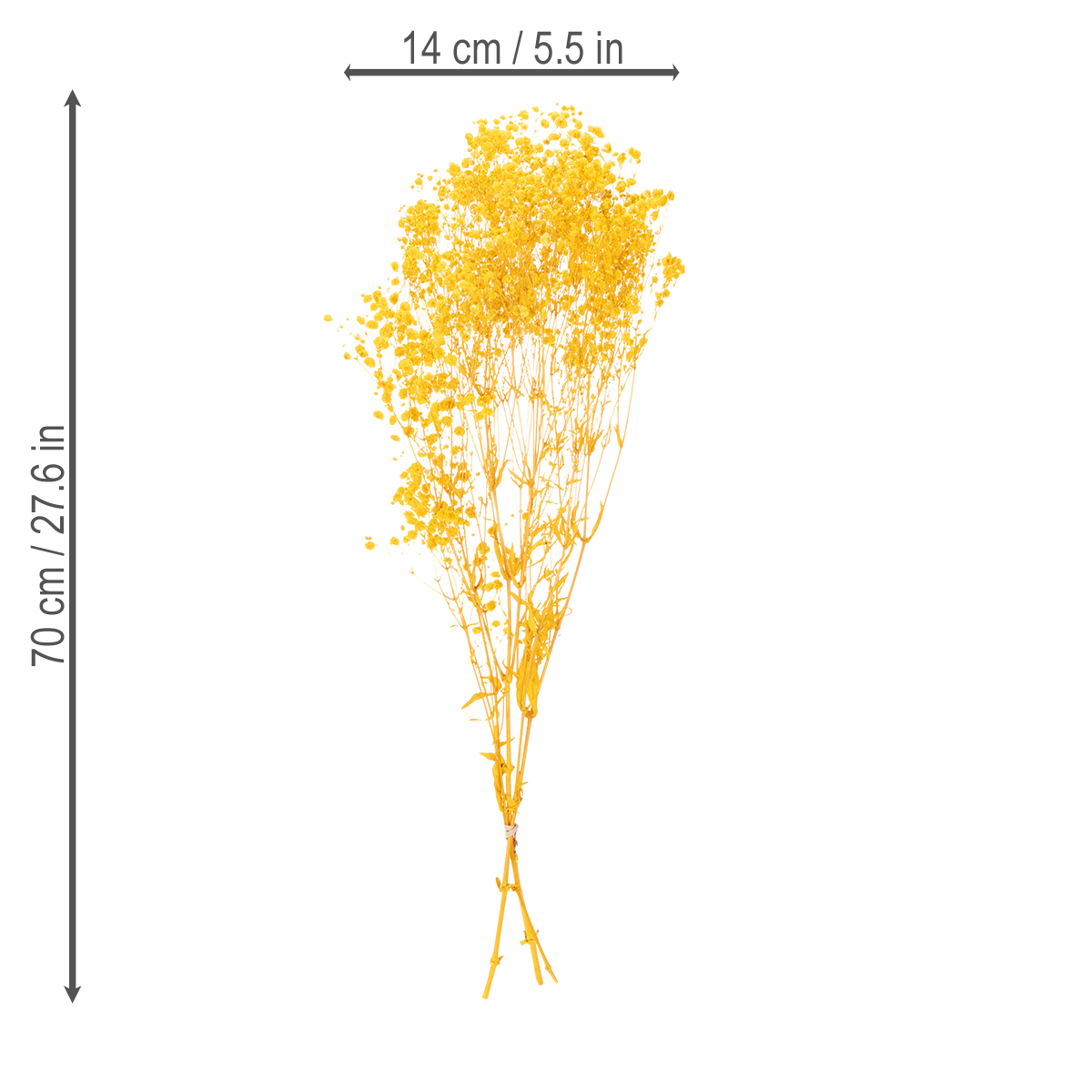 Il fiato del bambino simboleggia leggerezza ed eleganza e, in questo bouquet, aggiunge un allegro tocco di giallo caldo. Realizzato con fiori veri, accuratamente essiccati, questo bouquet è ideale per interni o spazi esterni riparati.