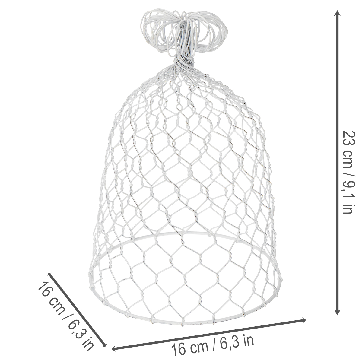 Realizzata in robusto metallo, questa campana emana un'eleganza senza tempo che si abbina perfettamente agli interni in stile rustico e country. Con un'altezza di 23 cm e un diametro di 16 cm, offre ampio spazio per tocchi decorativi personalizzati. La finitura bianca accentua il suo carattere vintage e si armonizza splendidamente con materiali naturali come legno, ceramica o fiori secchi. Che si tratti del soggiorno, di un patio coperto o di un grazioso dettaglio per matrimoni, questa campana in filo metallico ispira un arredamento creativo e unico.