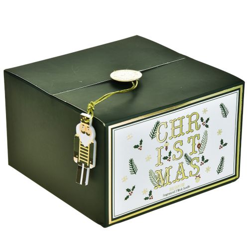 Anche la scatola è una bella idea regalo. In un'uniforme verde, uno schiaccianoci ti saluta come un ciondolo di schiuma. A grandi lettere su uno scudo color crema, la scritta in oro "Christmas" risalta con un sottile bordo verde bosco. Rami di abete e foglie e frutti di agrifoglio completano il grazioso segno.
