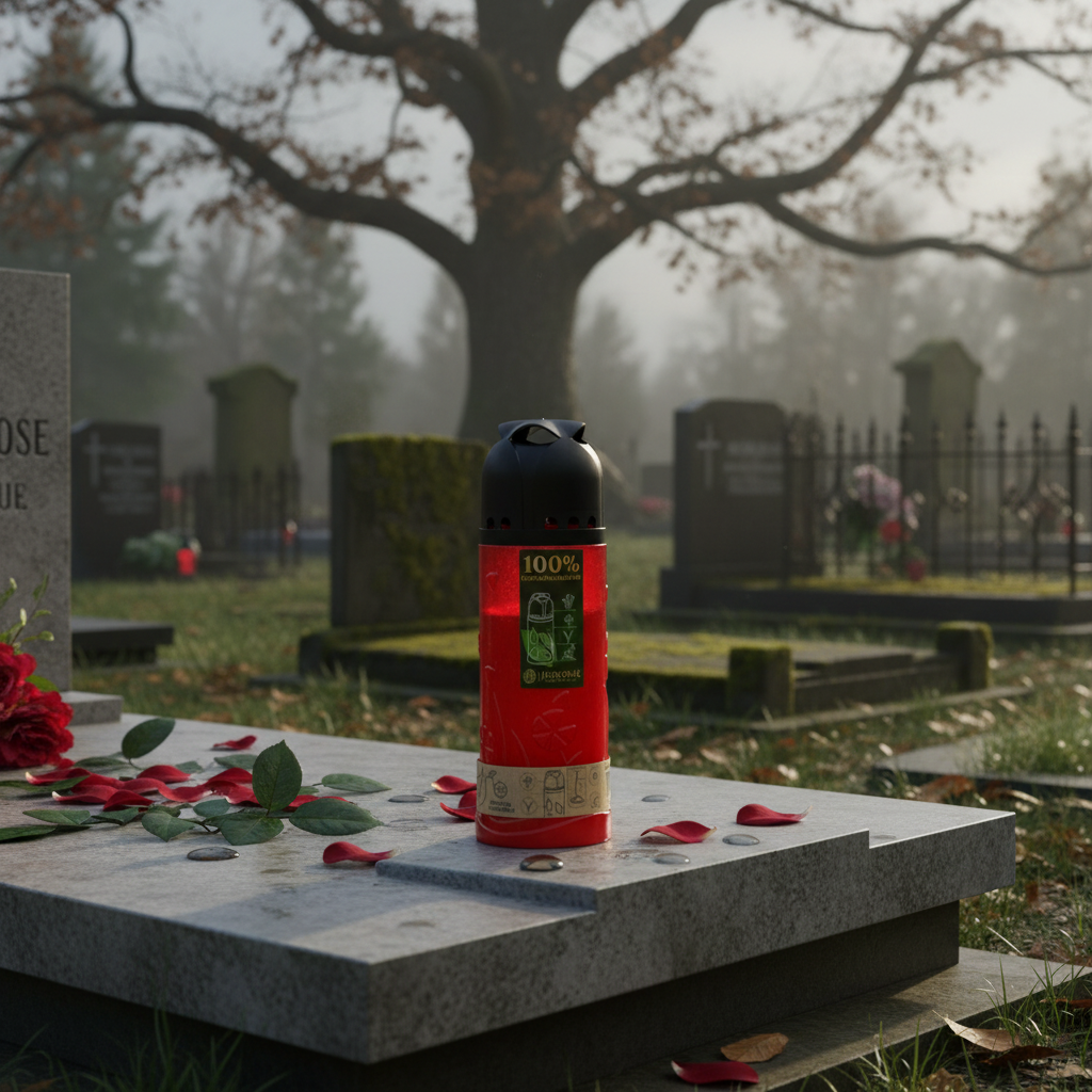 La candela cimiteriale realizzata con cura con il suo classico colore rosso si inserisce armoniosamente nell'immagine di ogni tomba e crea un'atmosfera di pace e riflessione. Il coperchio nero a forma di cupola protegge la luce e focalizza la fiamma in modo che possa sempre bruciare in sicurezza anche in caso di vento.