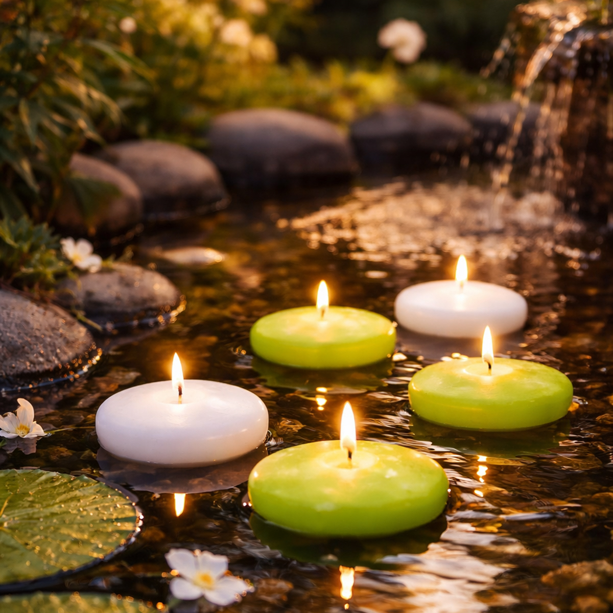 Grazie alle candele galleggianti, che fluttuano dolcemente tra ninfee, canne e altre piante acquatiche, il piccolo laghetto del tuo giardino diventa una magica oasi di tranquillità. In alternativa, puoi posizionare le candele in una grande vasca di zinco o in un secchio di latta pieno d'acqua: una piccola alternativa al laghetto che può essere una splendida decorazione per balconi e terrazze. Puoi persino usare queste insolite candele da tè come decorazioni da tavola. Basta riempire d'acqua un piatto fondo, un vaso di vetro o una lanterna più grande e lasciar fluttuare le candele galleggianti. Una fantastica alternativa al classico candeliere, che puoi personalizzare ulteriormente con petali di fiori, pietre e sabbia decorativa colorata.