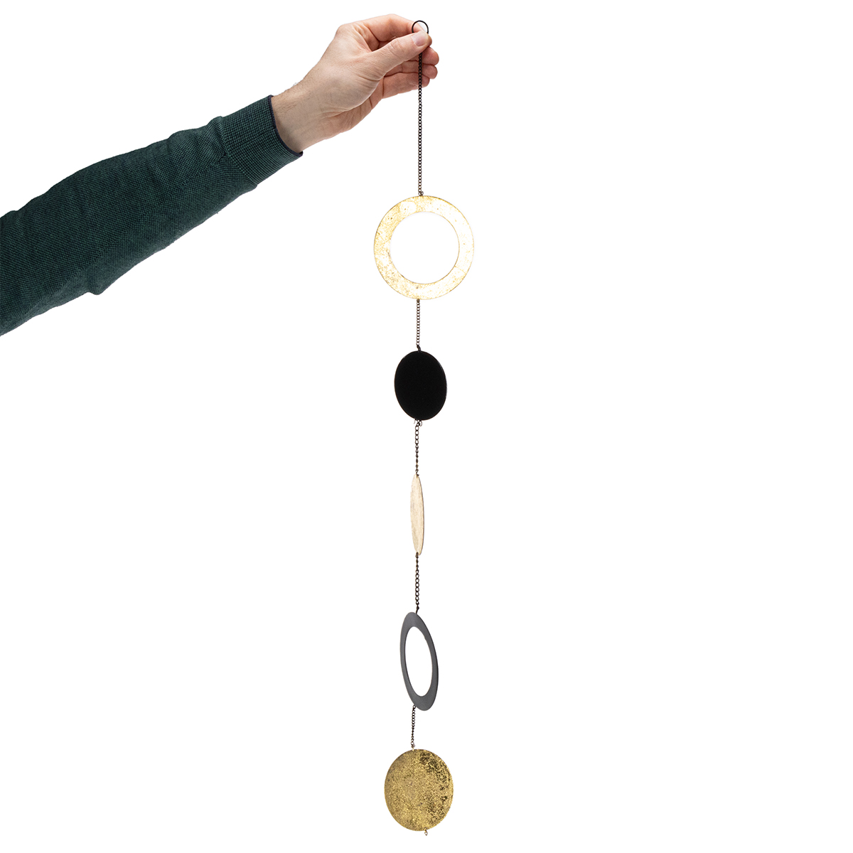 Questa decorazione è composta da cinque elementi rotondi di diverse dimensioni, a forma di dischi e anelli, alternati in nero e oro. Le decorazioni circolari pendenti sono collegate da sottili catene metalliche e ciascuna presenta un piccolo anello nella parte superiore per appenderle.