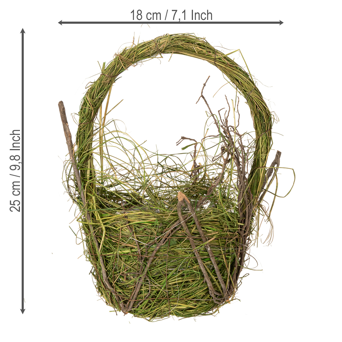 Questo cestino pasquale non è solo funzionale, ma anche un grazioso pezzo di design. Realizzato in erba di alta qualità e rifinito in verde, si abbina perfettamente a qualsiasi decorazione pasquale. Con un diametro di 18 cm e un'altezza di 25 cm, il cestino è ideale per Pasqua, sia che sia riempito con coniglietti di cioccolato, uova colorate o fiori freschi. Il suo design sobrio e naturale si integra perfettamente con un arredamento rustico o moderno in stile country, portando un tocco di natura direttamente nella vostra casa.