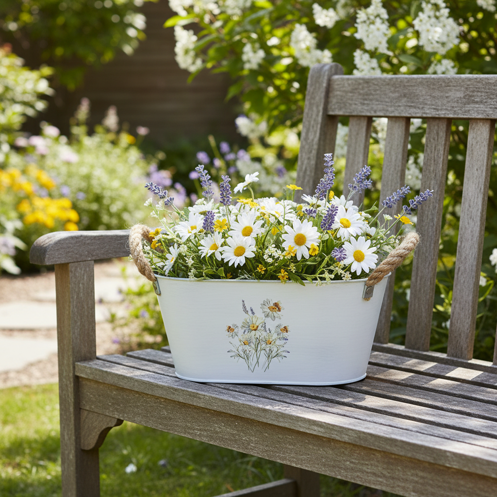 Usa il bellissimo vassoio per piante come base per la tua prossima sistemazione estiva o pianta subito fiori in casa o sul balcone. Per i fiori veri si consiglia di stenderli con pellicola e argilla espansa come drenaggio.
