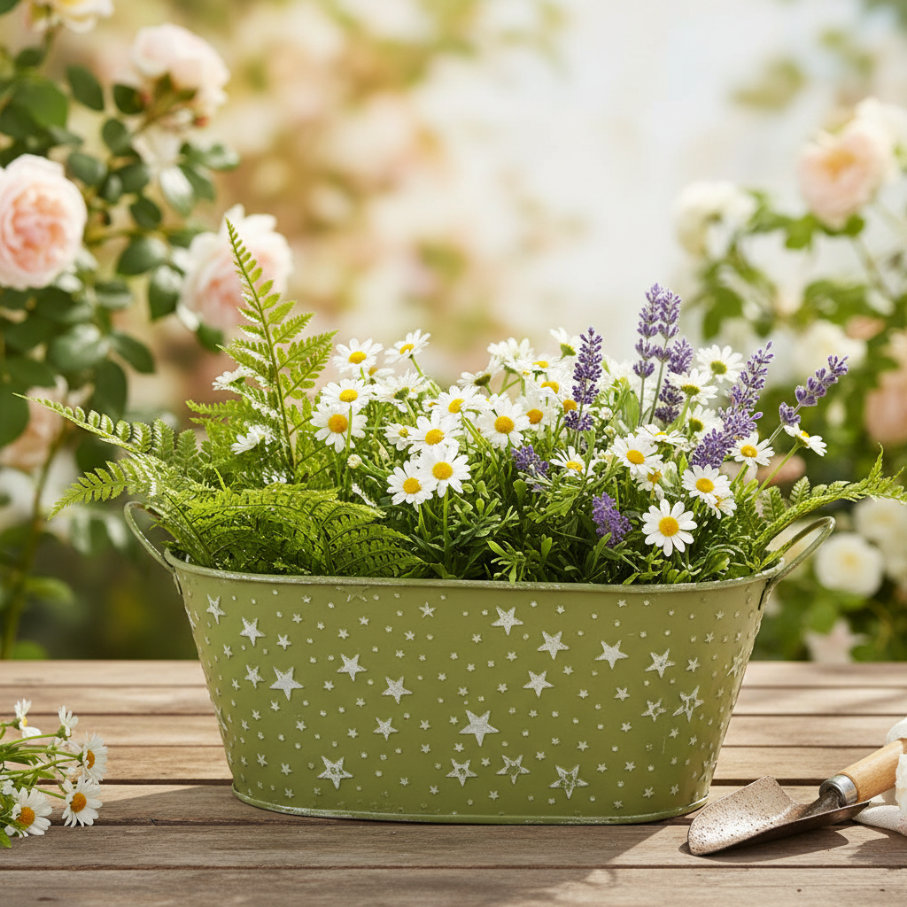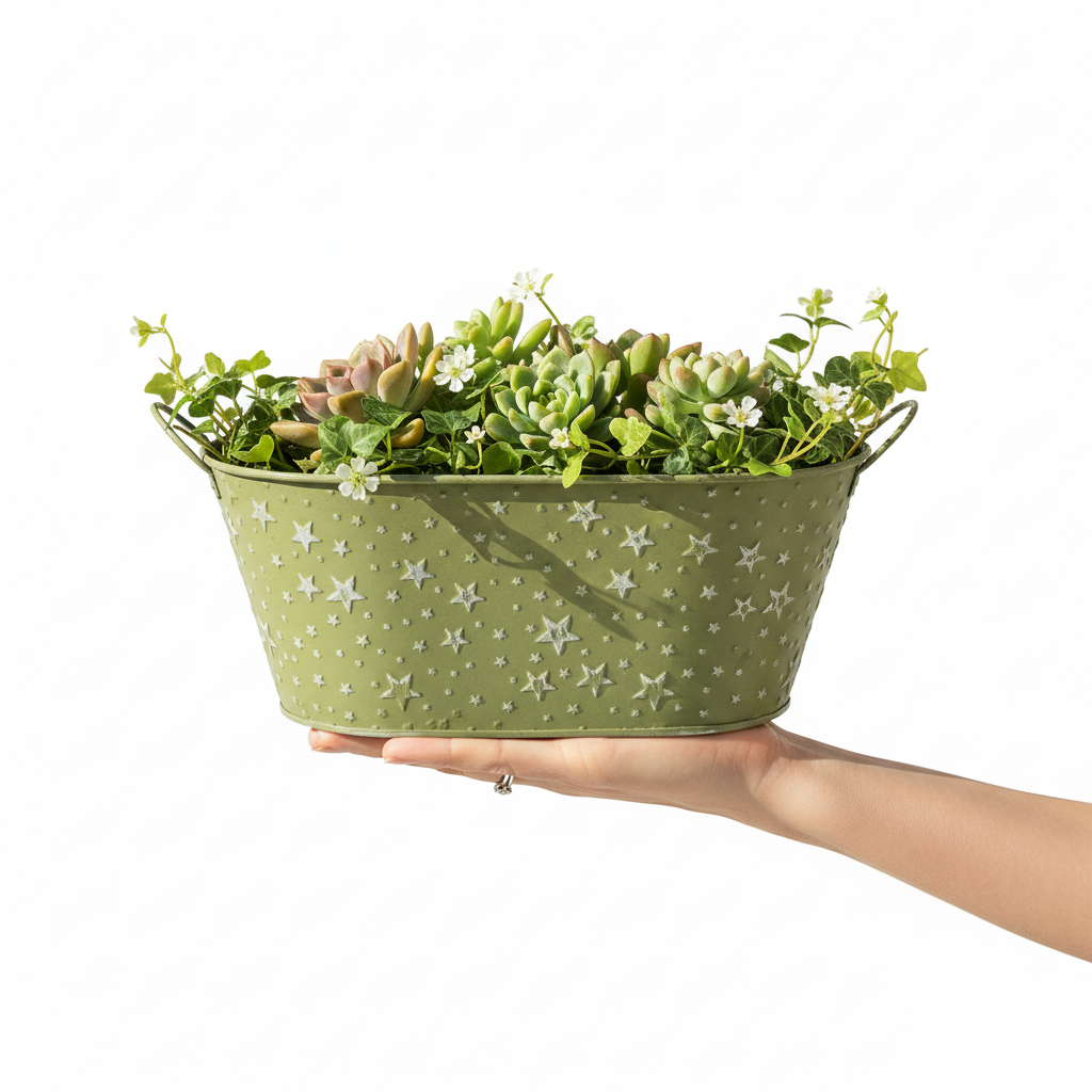 Benvenuti in un mondo pieno di sogni decorativi! Che venga utilizzata come vaso da fiori per Natale, fioriera per piante festive o elegante ciotola per composizioni floreali, questa ciotola verde muschio con stelle in rilievo è la scelta perfetta per decoratori e fioristi attenti ai dettagli. La vernice parzialmente usurata sulle stelle e il metallo traslucido creano un vaso da fiori decorativo natalizio unico che non dovrebbe mancare in nessuna stanza decorata a festa.