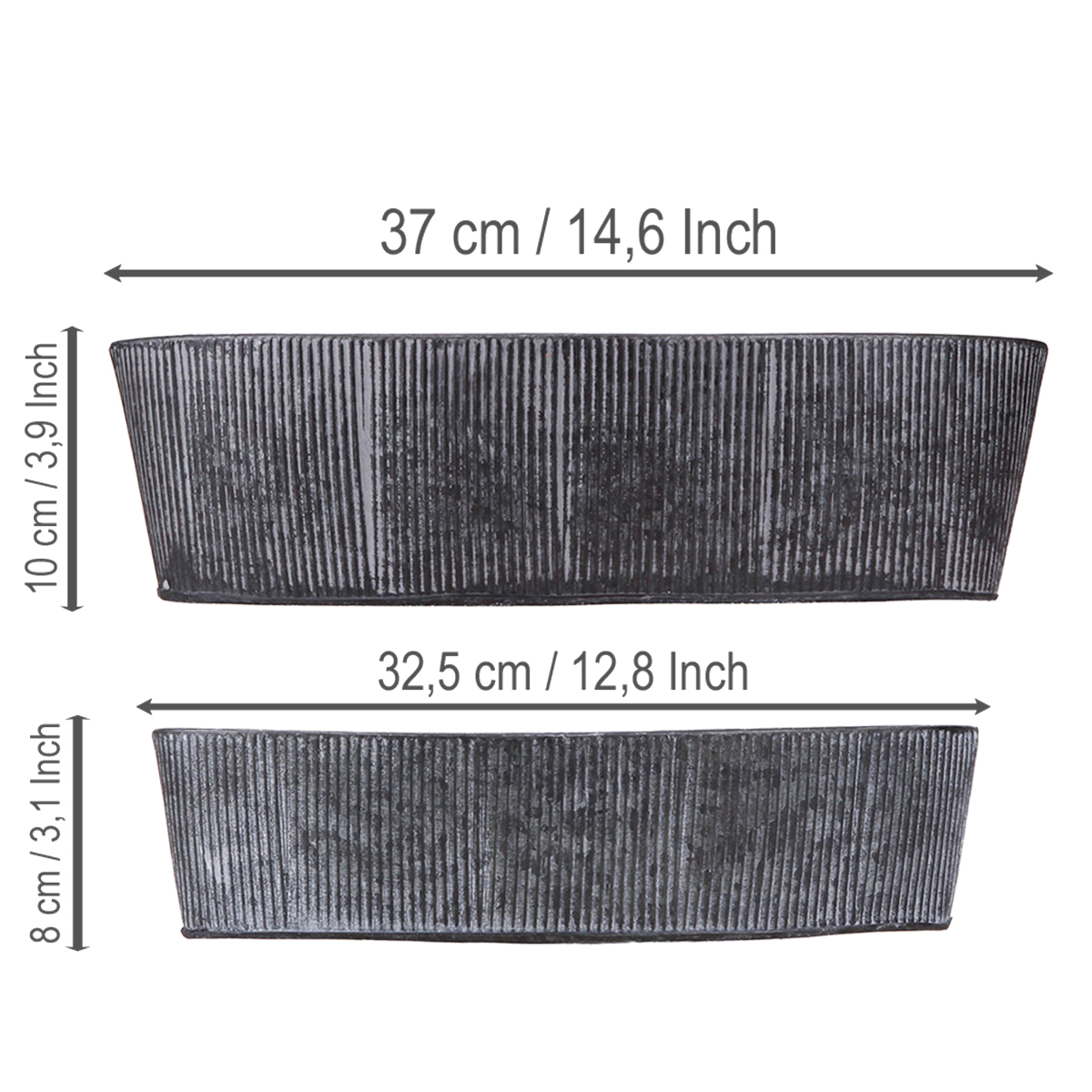 La ciotola ovale in metallo e nero coniuga un'eleganza raffinata con un'affascinante estetica vintage che valorizzerà la vostra casa. Che si tratti di una ciotola decorativa accattivante, di una nostalgica decorazione da tavola o di una rustica ciotola per fiori, questo set di due ciotole in metallo impilabili apre innumerevoli possibilità creative. L'elegante combinazione di colori in nero e grigio slavato e il raffinato design delle scanalature si armonizzano perfettamente con qualsiasi interno in stile shabby chic o industriale. Utilizzate le ciotole come contenitori per le piante e aggiungete un tocco di verde con piante da appartamento o erbe aromatiche. Quello più piccolo è perfetto per riporre con stile le chiavi o le piante grasse.