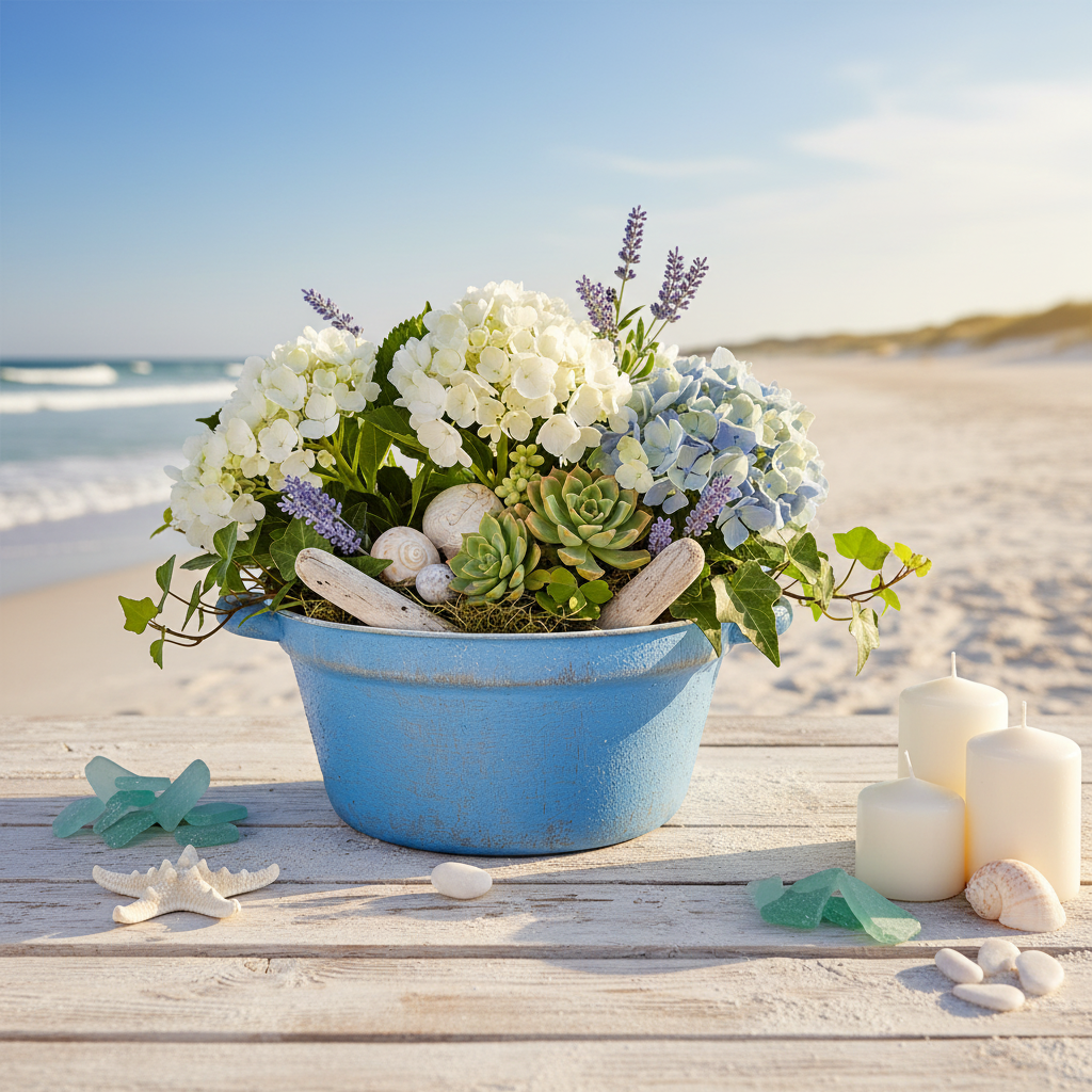 La decorazione in metallo è bella anche con pietre decorative o sabbia e piante grasse. Grazie alla combinazione di colori, la fioriera si adatta perfettamente anche a qualsiasi decorazione marittima. Decorare la ciotola con sabbia, fiori secchi, conchiglie e legni. È così che il portavaso in metallo diventa un'armoniosa decorazione da tavola.