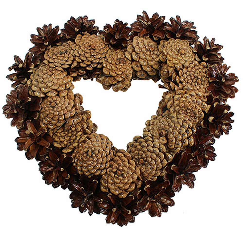 Il cuore piatto a spillo è fatto di pigne, che sono dipinte sul davanti e sul retro in modo naturale e sono tenute insieme da un filo robusto. Il cuore ha un diametro totale di circa 30 centimetri ed è alto circa 6 centimetri.