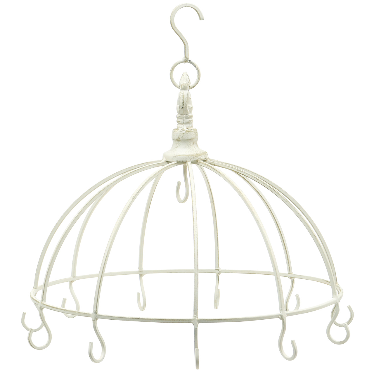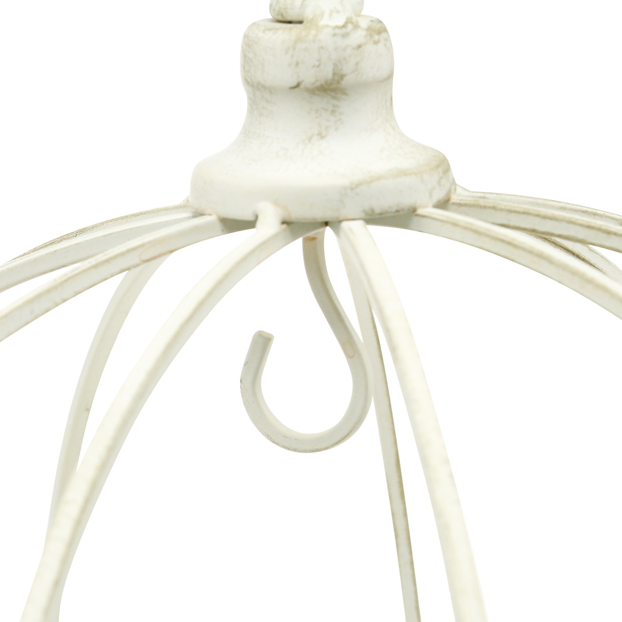 La graziosa corona decorativa in metallo in bianco ha una punta decorata floreale e un grande gancio per appenderla. Un totale di undici ganci sull'anello inferiore ti invitano a decorare in vari modi. L'anello decorativo ha un diametro di circa 29 centimetri. Con il gancio, il diametro della corona decorativa è di circa 34 centimetri. L'altezza del cesto è di circa 17 centimetri. Quando è sospesa, la corona in metallo è alta circa 32 centimetri.