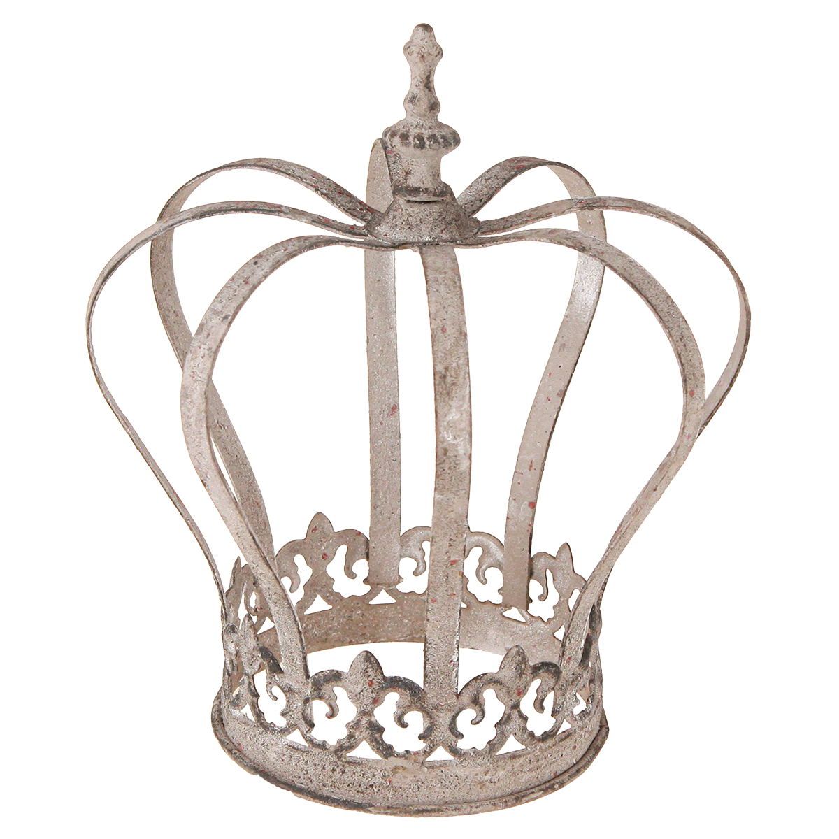 Con questa corona decorativa non ci saranno limiti alla vostra creatività. La corona in metallo è di colore grigio sbiadito e decorata in alcuni punti con color ruggine, il che le conferisce un tocco vintage e si adatta perfettamente allo stile shabby chic di tendenza. Le barre leggermente curve terminano con un giglio, un tempo stemma dei re francesi.