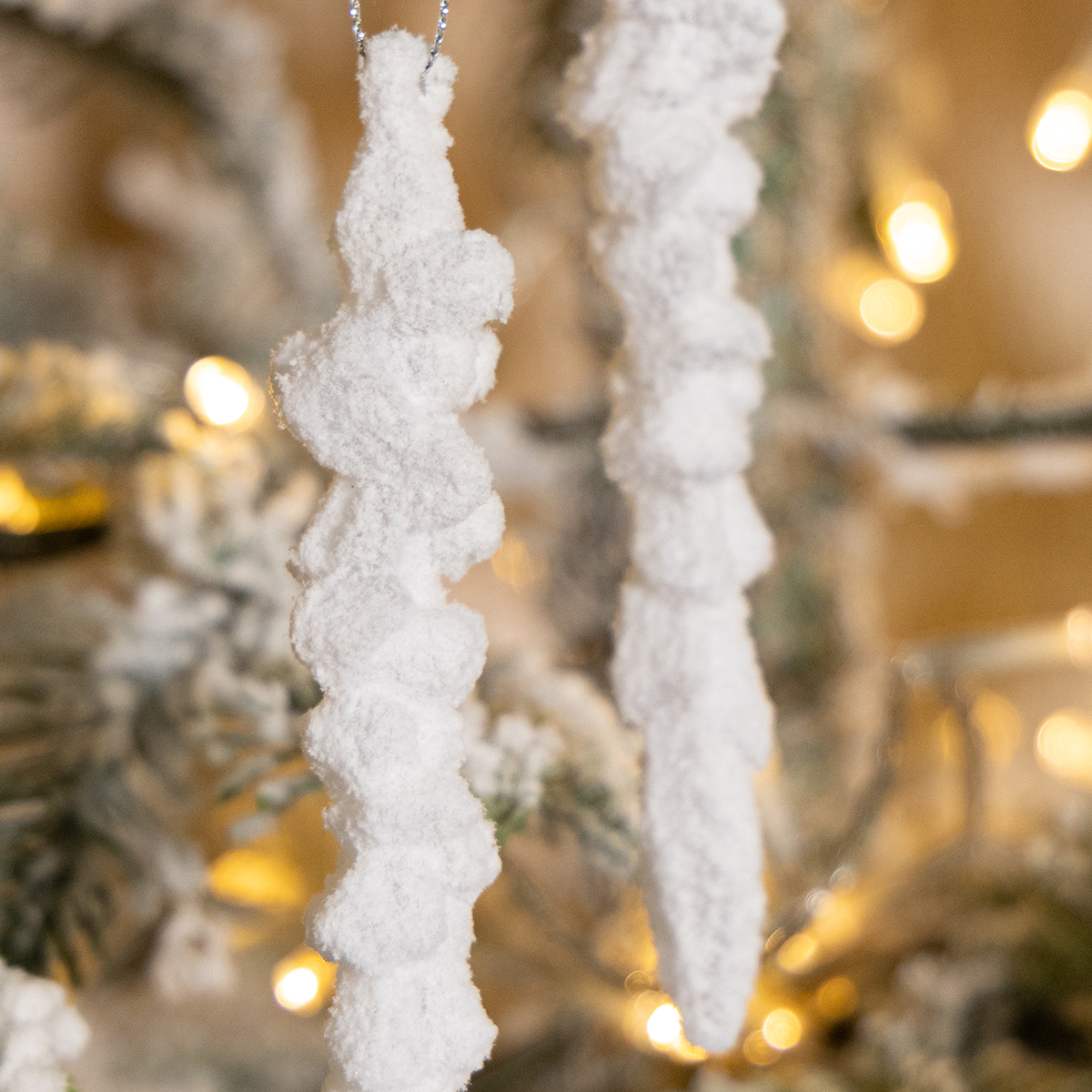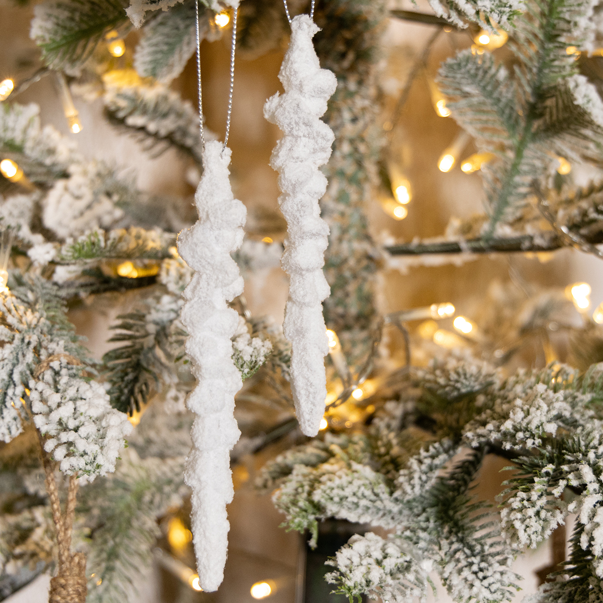 Decorazioni natalizie innevate a forma di ghiaccioli: magia invernale bianca per il soggiorno