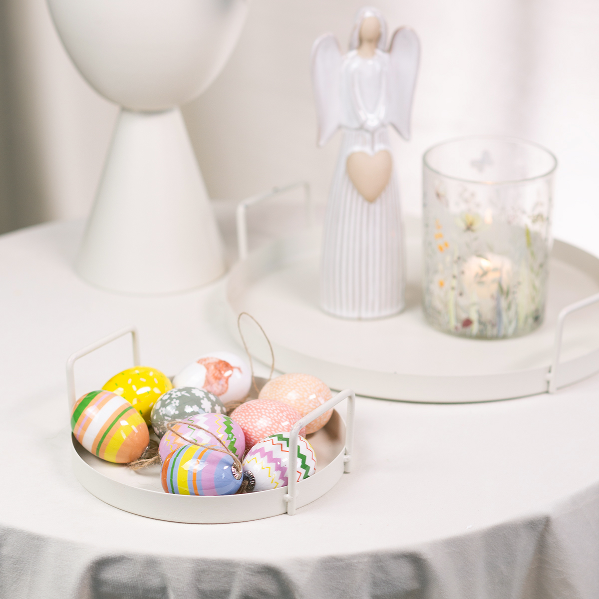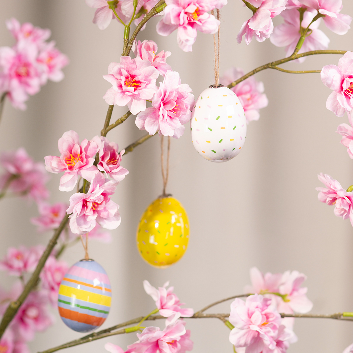 Che siano sull'albero di Pasqua, in un grande bouquet primaverile o come dettaglio d'effetto per confezionare i regali, queste uova di Pasqua sono sempre perfette. Un dettaglio particolare: i loro colori vivaci si abbinano magnificamente ad altri elementi decorativi, come ghirlande primaverili o vasi colorati. Per un look più naturale, disponi le uova con rametti, muschio e nidi pasquali. Sono particolarmente belle se completate da delicate decorazioni a forma di farfalla o statuette in ceramica dai colori pastello. Il verdetto? Questa decorazione pasquale aggiunge un tocco di colore a qualsiasi stile d'interni, da un accogliente look country a un design moderno e minimalista. Semplicemente meraviglioso!
