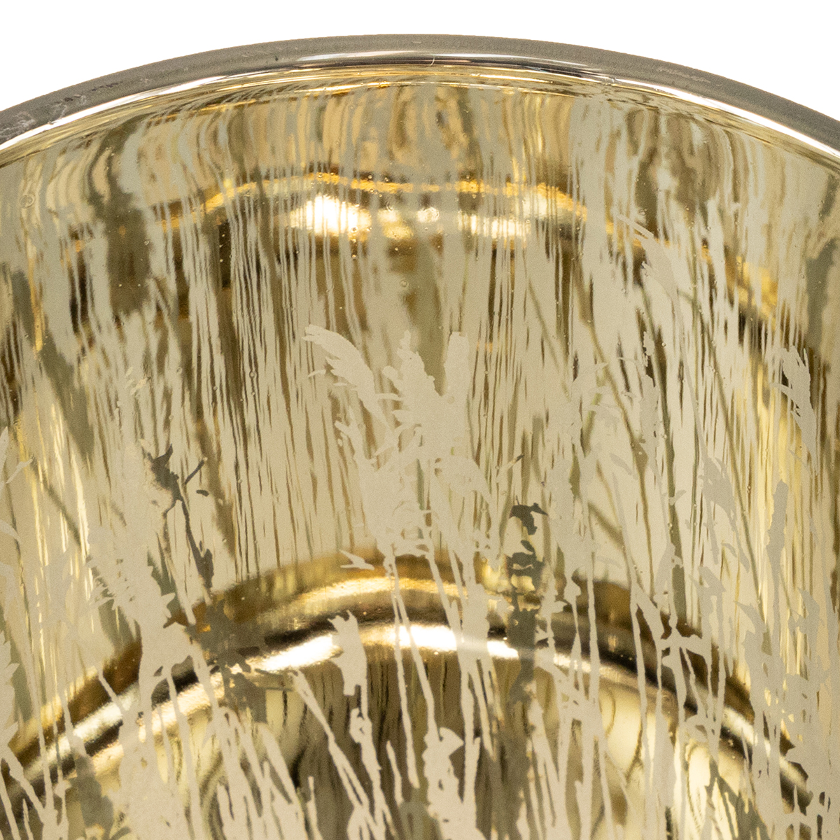 Grazie alle sue dimensioni e alla sua robustezza (diametro: 10 cm, altezza: 12,5 cm), offre spazio per lumini da tè o piccole candele a colonna. L'effetto del vetro illuminato è particolarmente suggestivo nelle stanze buie, poiché la luce filtra attraverso i delicati motivi dorati, creando ombre intricate. È perfetto come illuminazione romantica in camera da letto, ma crea anche un effetto suggestivo durante le feste estive o le riunioni in giardino. Per un look più classico, può essere abbinato a colori tenui e materiali naturali come il legno o il lino.