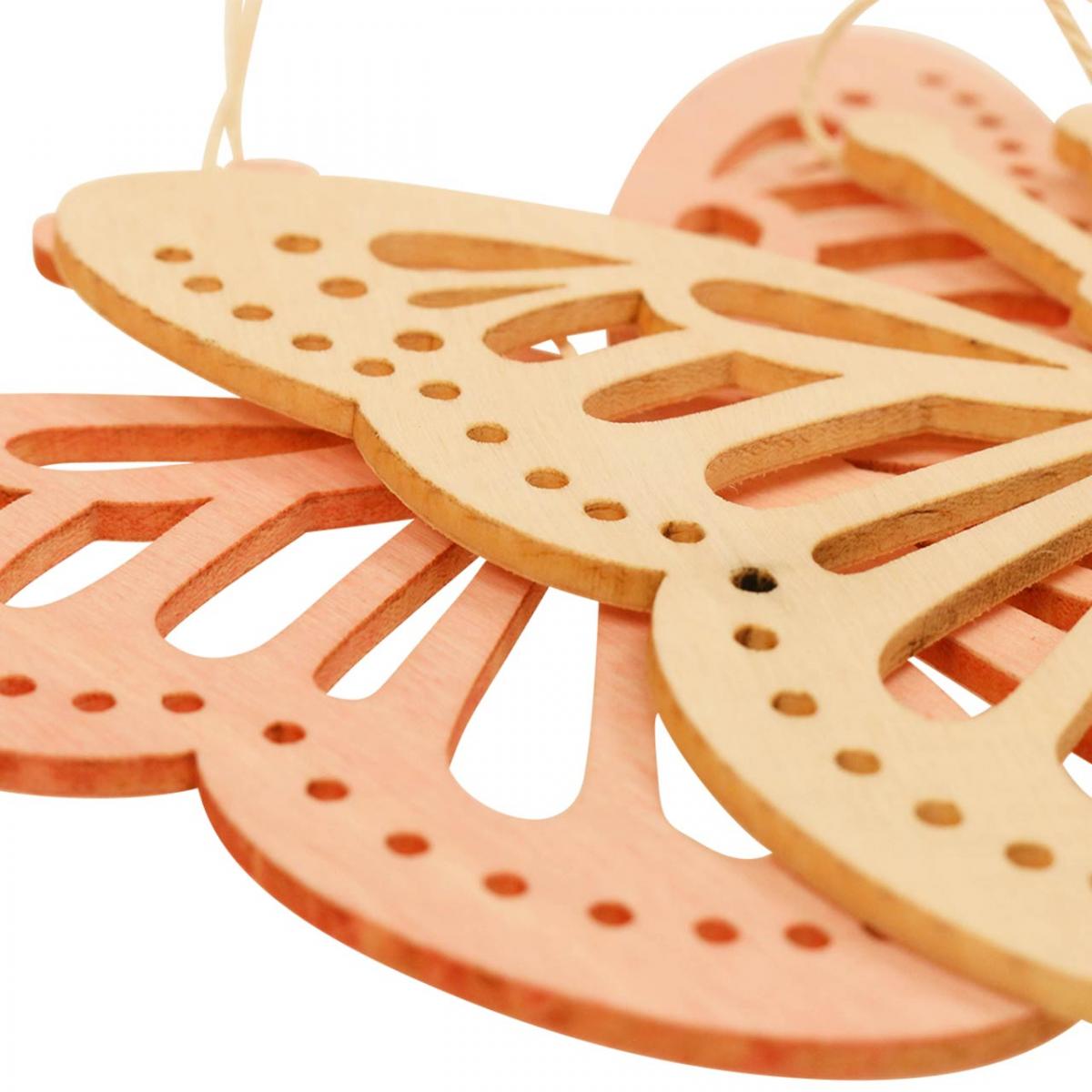 Le farfalle sono costituite da piatti di legno sottili e leggeri, le cui forme e dettagli sono stati elaborati in filigrana. Ogni ciondolo decorativo ha un anello colorato per appenderlo.
