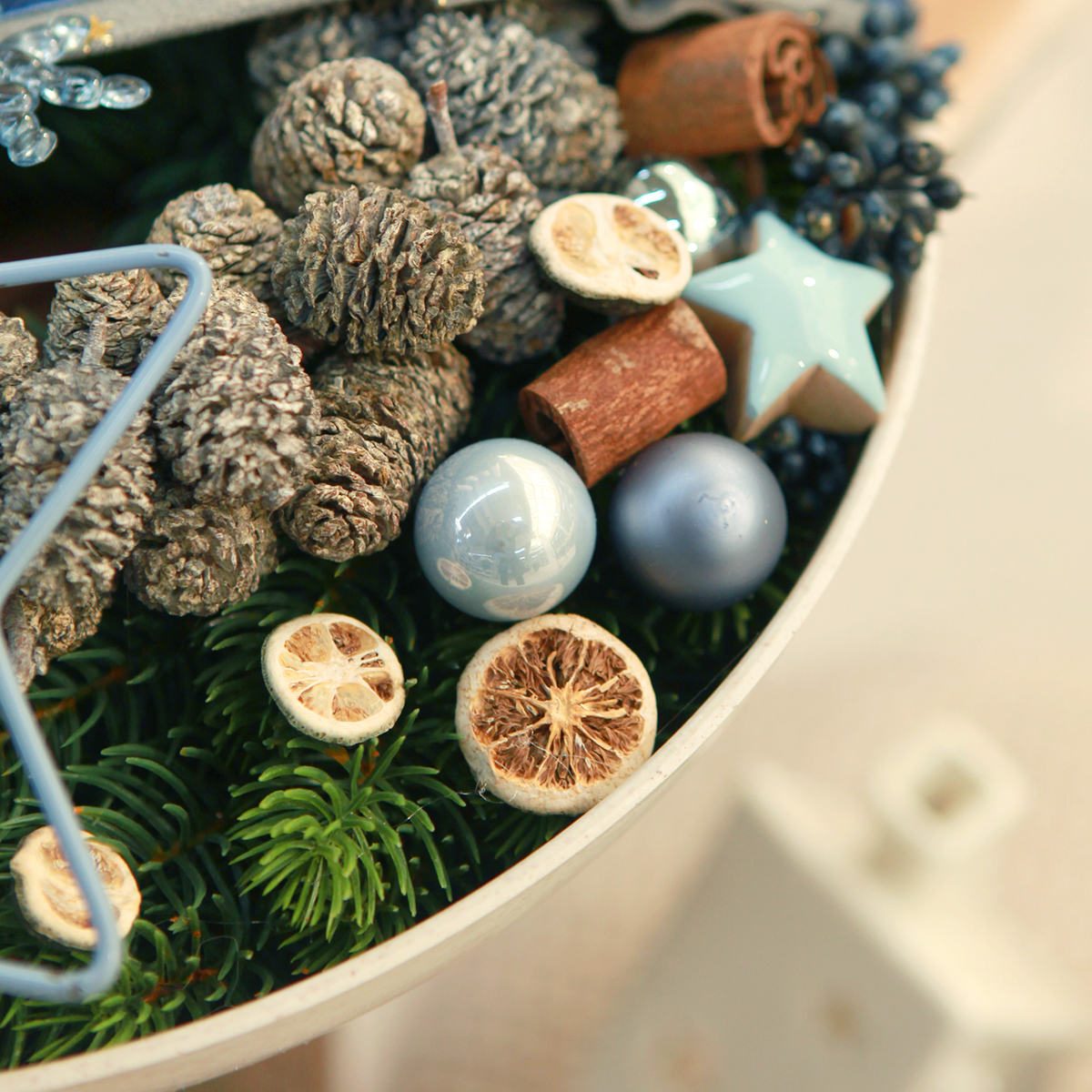 Materiali: materiali naturali come coni, legno, corteccia, muschio, ramoscelli, foglie, fiori secchi, alghe e fibra di cocco.
