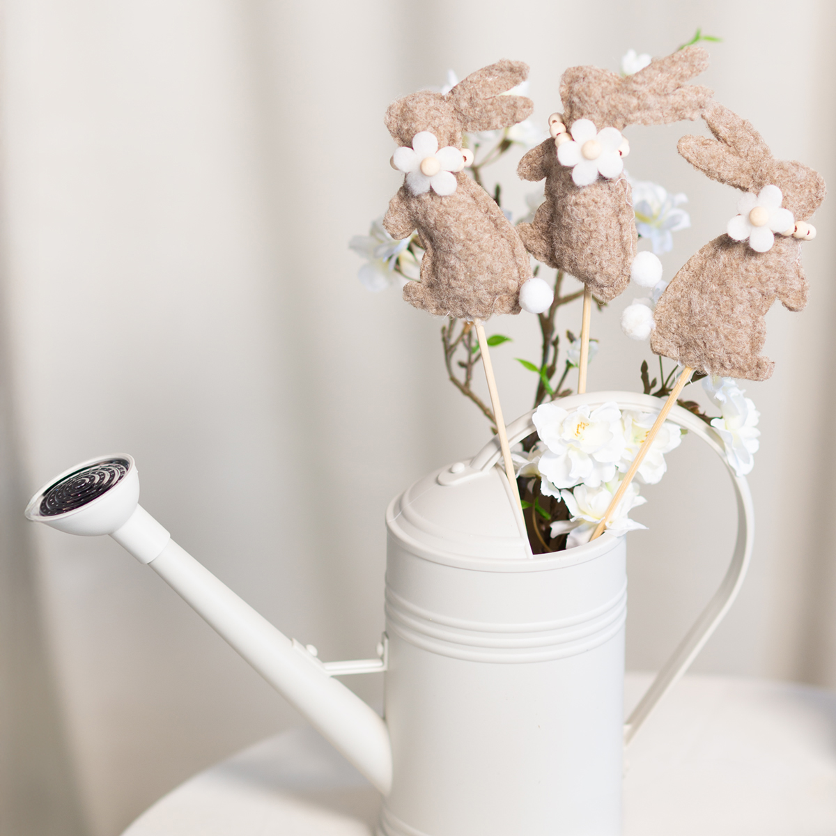 Questa decorazione a forma di coniglietto pasquale è un vero gioiello per gli amanti della decorazione creativa. Le figure sono realizzate in feltro di alta qualità in una calda tonalità marrone che emana naturalezza e intimità. I dettagli incantevoli, come il delicato fiore e la piccola coda soffice, conferiscono ai coniglietti un fascino speciale. Il robusto bastoncino facilita la disposizione dei coniglietti in vasi, fioriere o composizioni floreali. Chi preferisce il design minimalista o scandinavo adorerà lo stile sobrio ma espressivo di queste figure.