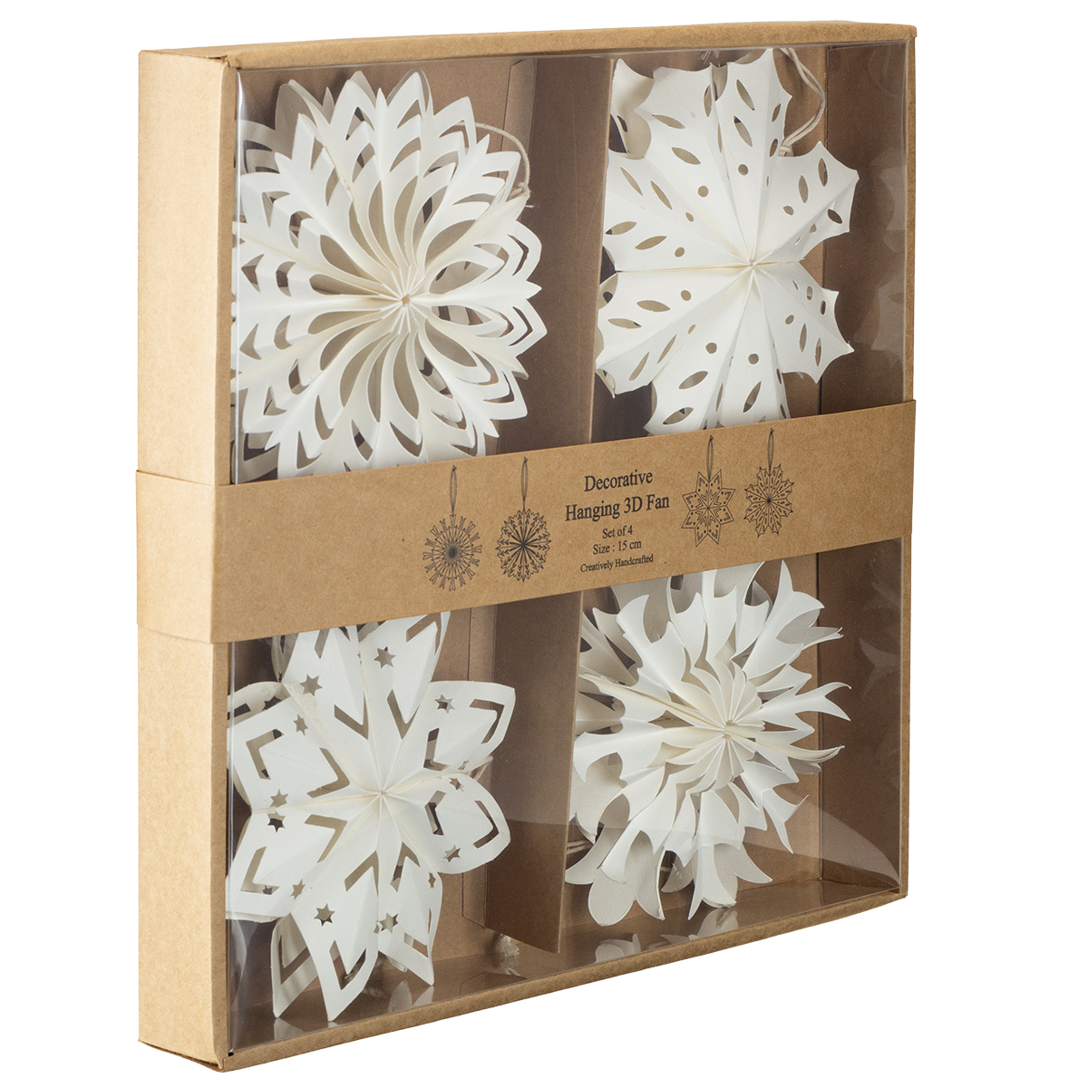 I nostri fiocchi di neve decorativi in carta uniscono stile, semplicità e praticità. Il set include quattro fiocchi di neve diversi, ognuno con un motivo traforato che ricorda l'aspetto unico dei veri fiocchi di neve. Realizzati in carta spessa e di alta qualità, offrono stabilità e un aspetto elegante. Appenderli è un gioco da ragazzi con il cordino di cotone incluso e, grazie al loro colore bianco neutro, i fiocchi di neve si adattano a quasi tutti gli stili decorativi.