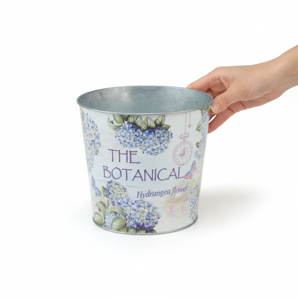 Questa fioriera in metallo è piena di romanticismo estivo! Le ortensie sul vaso circondano piante e fiori con la magia di un giardino fiorito.