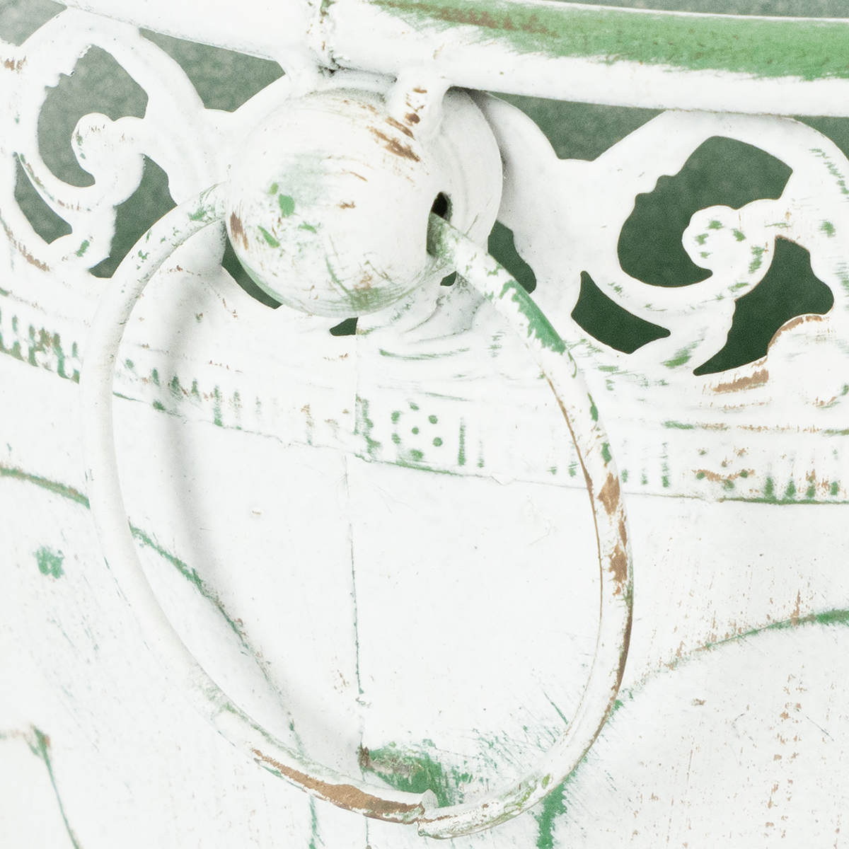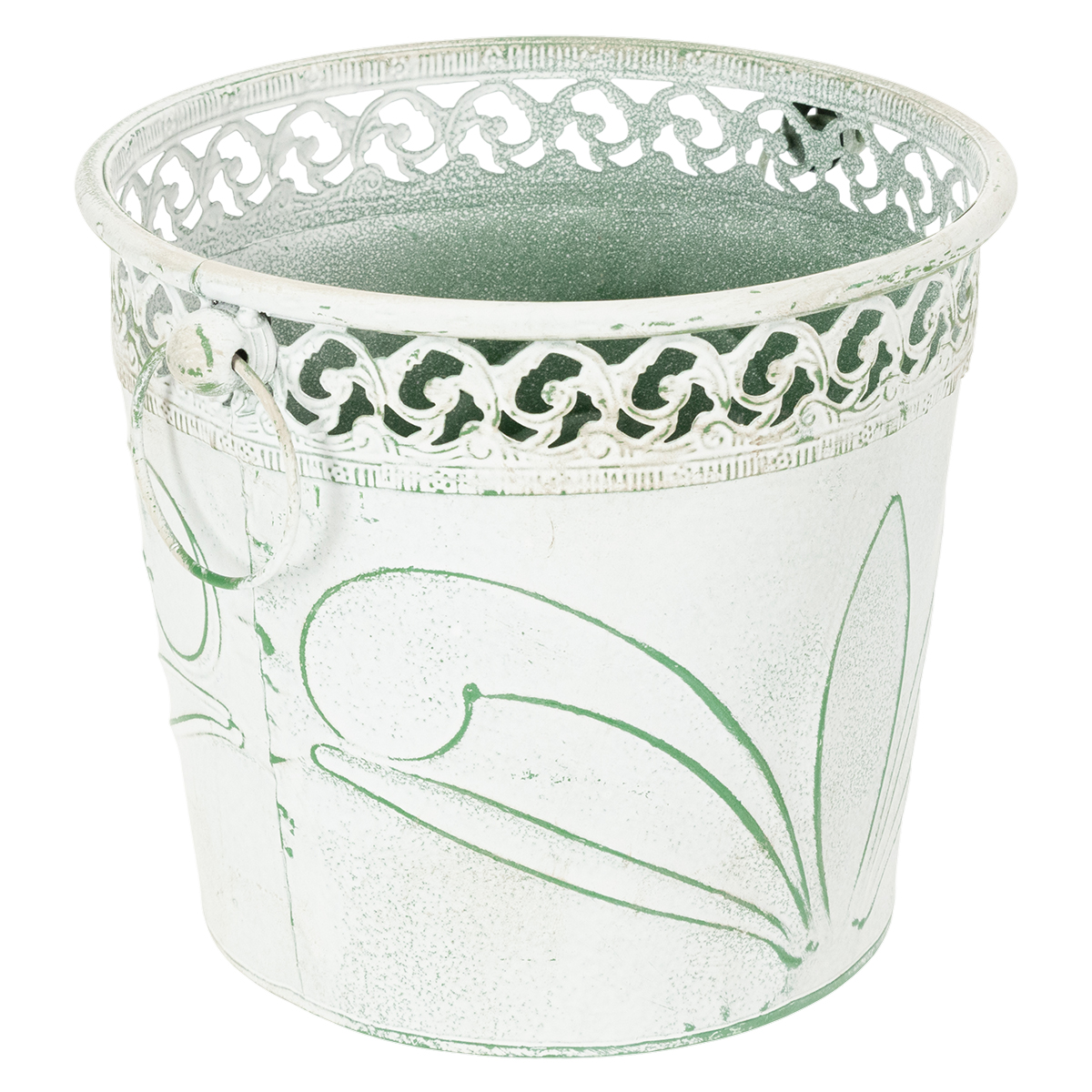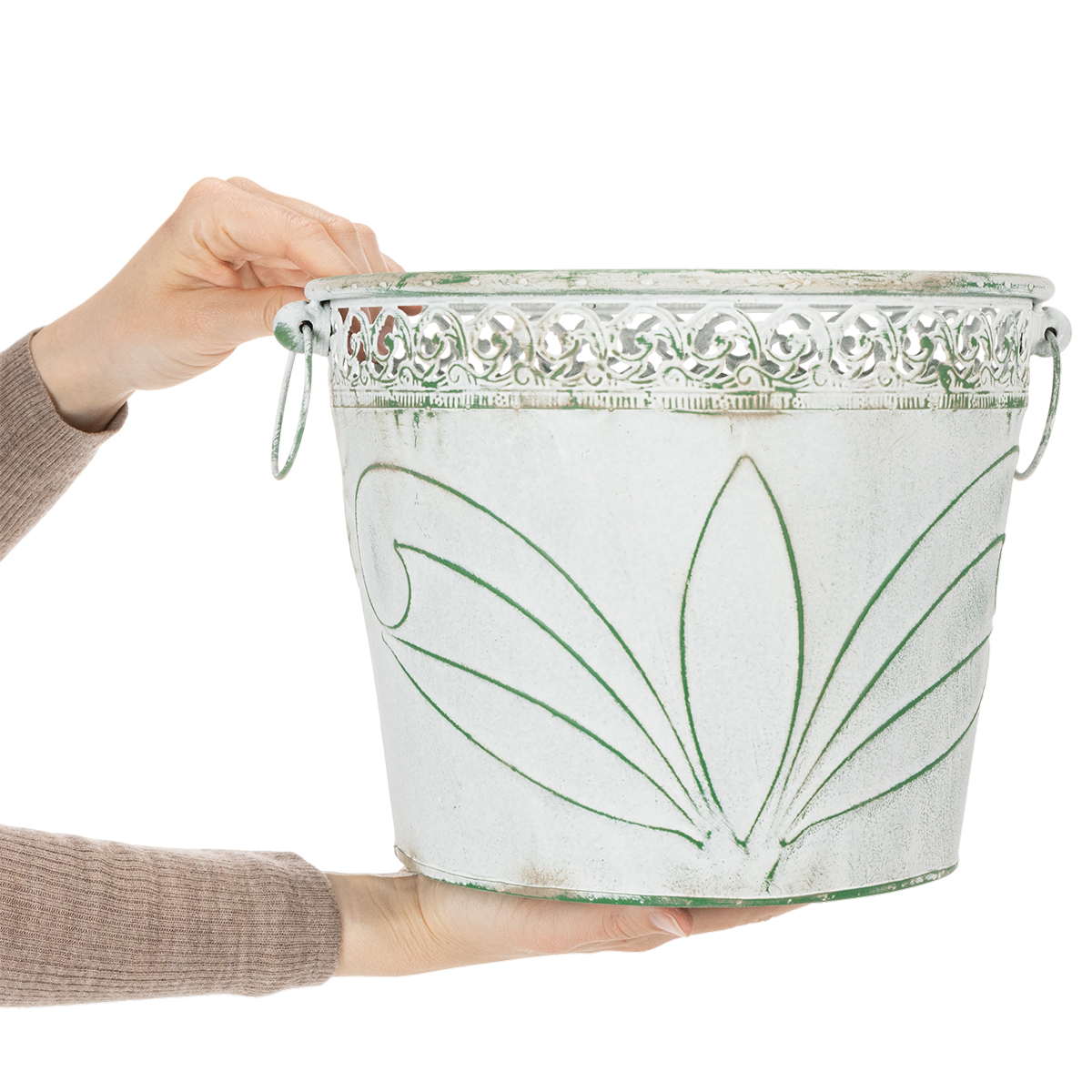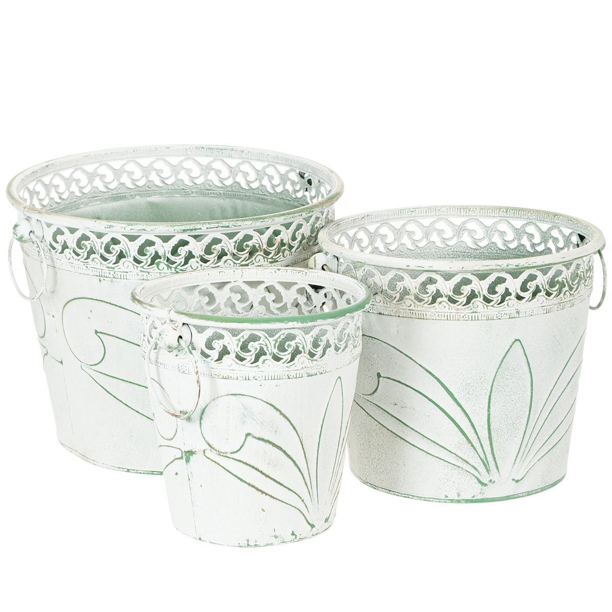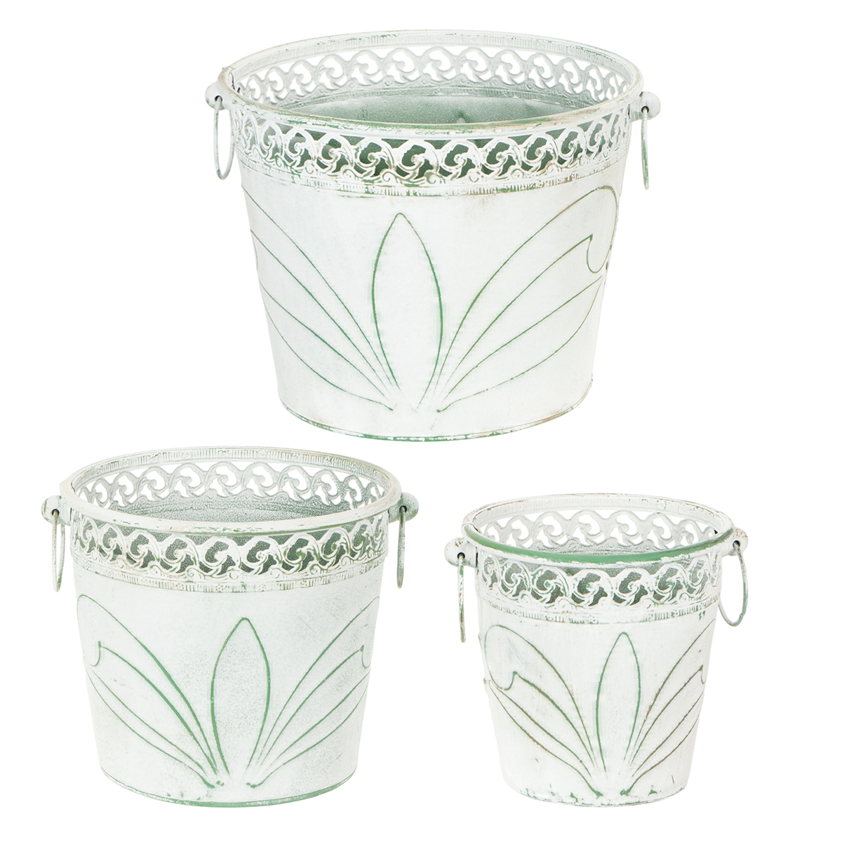 Fioriera in metallo sbalzato con manici, bianca e verde, stile shabby chic, H22/19.5/17.5cm, Ø25.5/20.5/15.5cm, set da 3