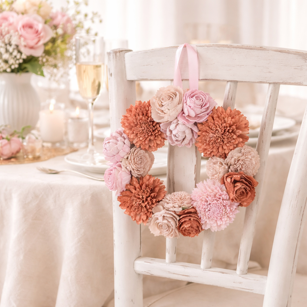 Aggiungete un tocco di romanticismo ed eleganza alla vostra casa! Questa ghirlanda floreale rosa da appendere crea un'atmosfera da sogno in qualsiasi ambiente e favorisce un'armonia perfetta. Che sia esposta sulla parete del soggiorno, come centrotavola o persino come decorazione per la porta, i colori naturali e il design affascinante di questa ghirlanda decorativa, realizzata in legno di Sola, creano un elegante complemento d'arredo. Con un diametro di 25 centimetri e la sua delicata tonalità rosa, la ghirlanda è perfetta per occasioni festive, feste o matrimoni, così come un delizioso accessorio per la casa da usare tutti i giorni.