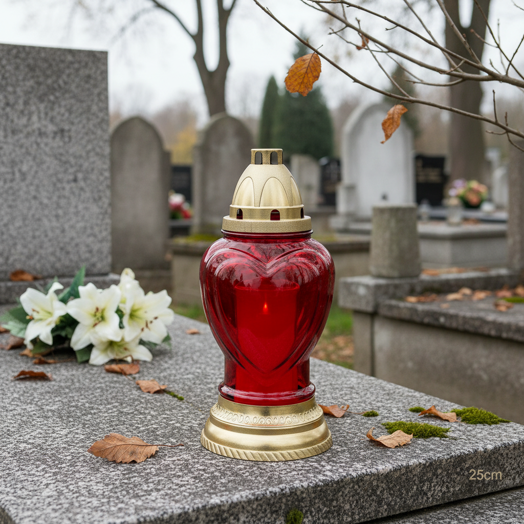 La lanterna funeraria è decorata con un intramontabile rilievo a forma di cuore su entrambi i lati, che conferisce alla lampada un aspetto elegante. Il coperchio e la base sono in plastica e presentano anch'essi una forma elegante.