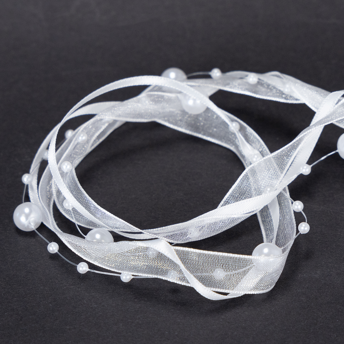 La fede nuziale in bianco ha una lunghezza di circa 5 metri ed è avvolta su un rotolo di plastica. La larghezza è di circa 20 millimetri e le perle hanno un diametro da circa 0,2 a circa 0,8 centimetri.