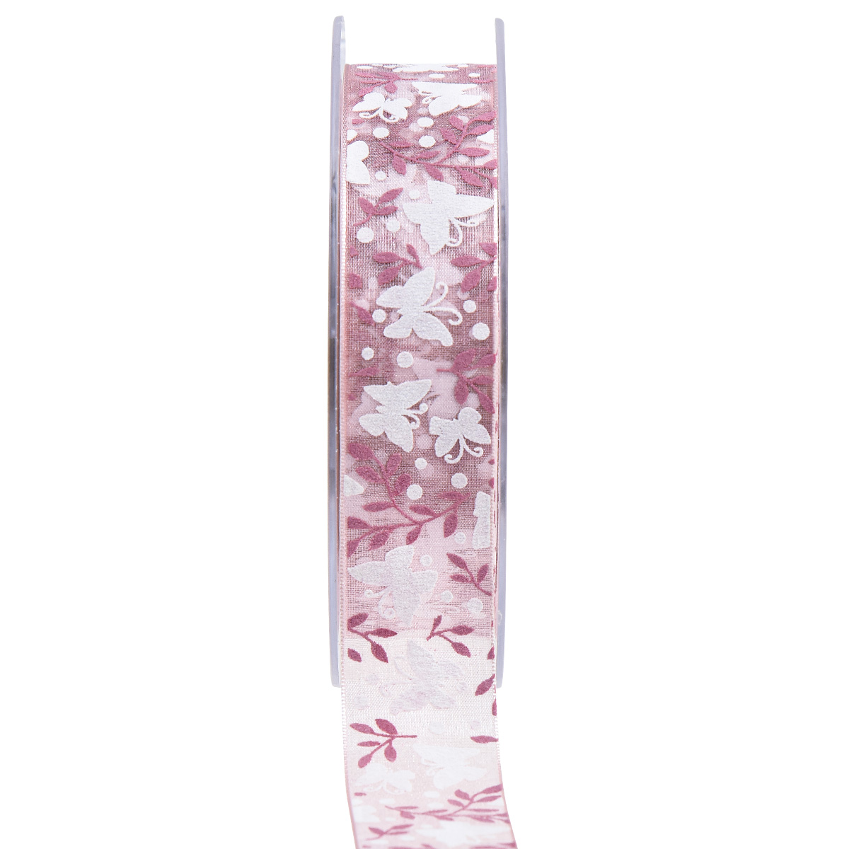 Il nastro di organza rosa con motivo a farfalla è avvolto su un rotolo di plastica ed è lungo circa 20 metri e largo circa 25 millimetri.