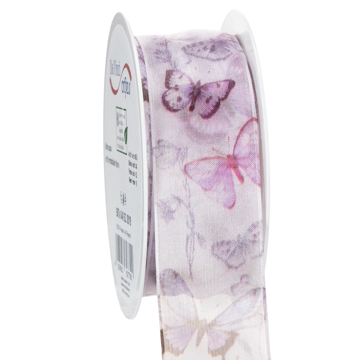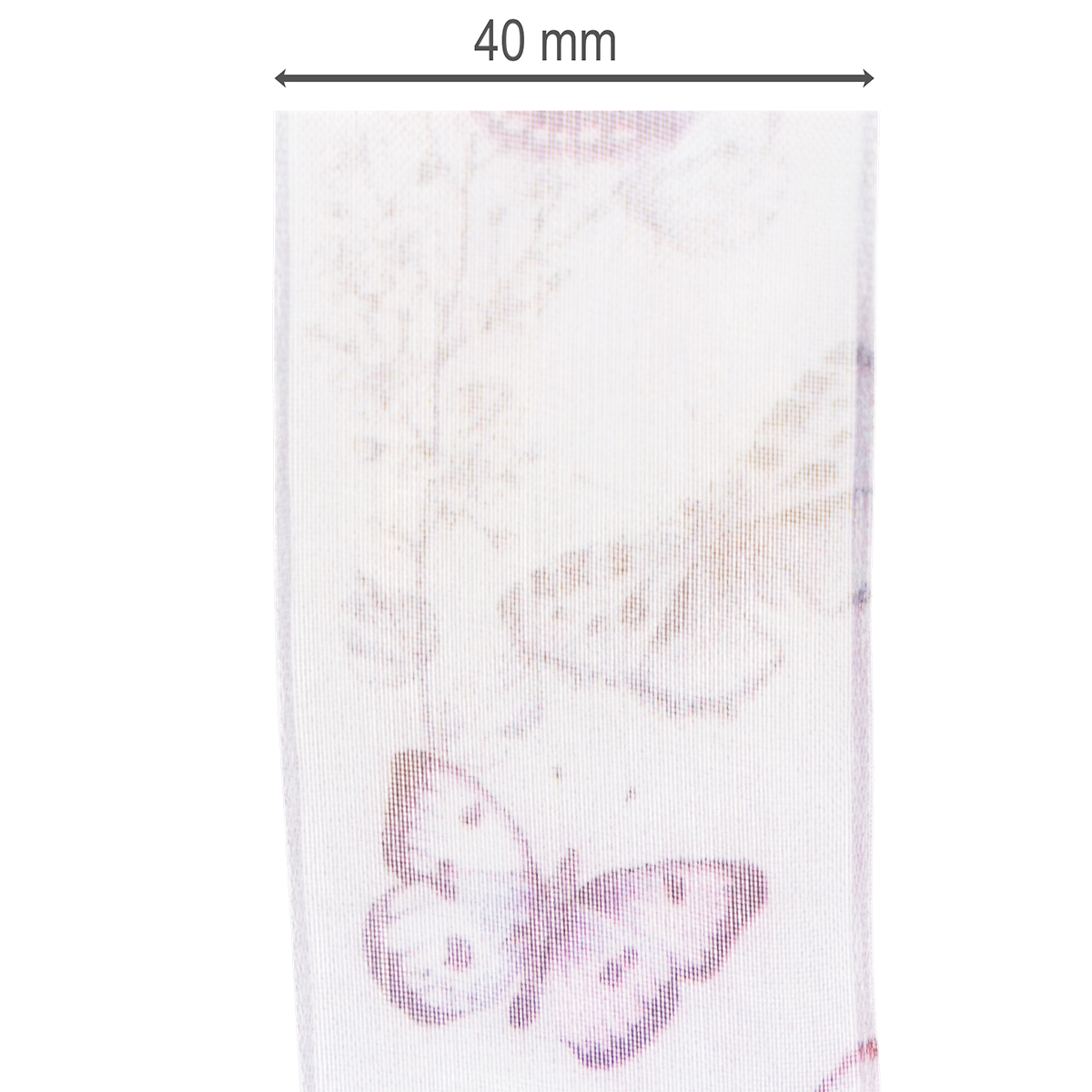 Le farfalle raffigurate nei minimi dettagli appartengono a specie diverse, esotiche e particolarmente belle, il che rende il motivo molto sofisticato. L'ampio nastro di chiffon ha un aspetto delicato e leggero grazie al tessuto di organza trasparente, mentre il bordo assicura che i fiocchi mantengano la loro forma.