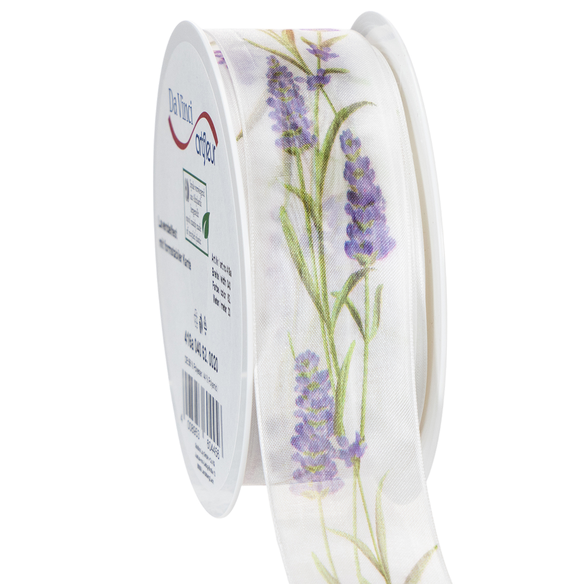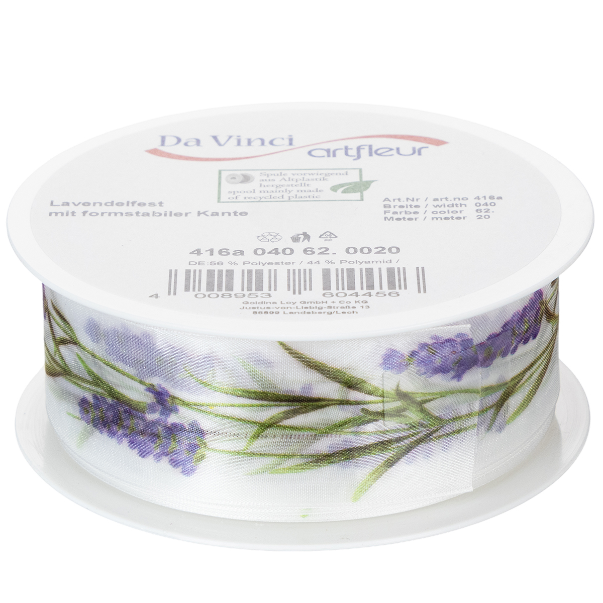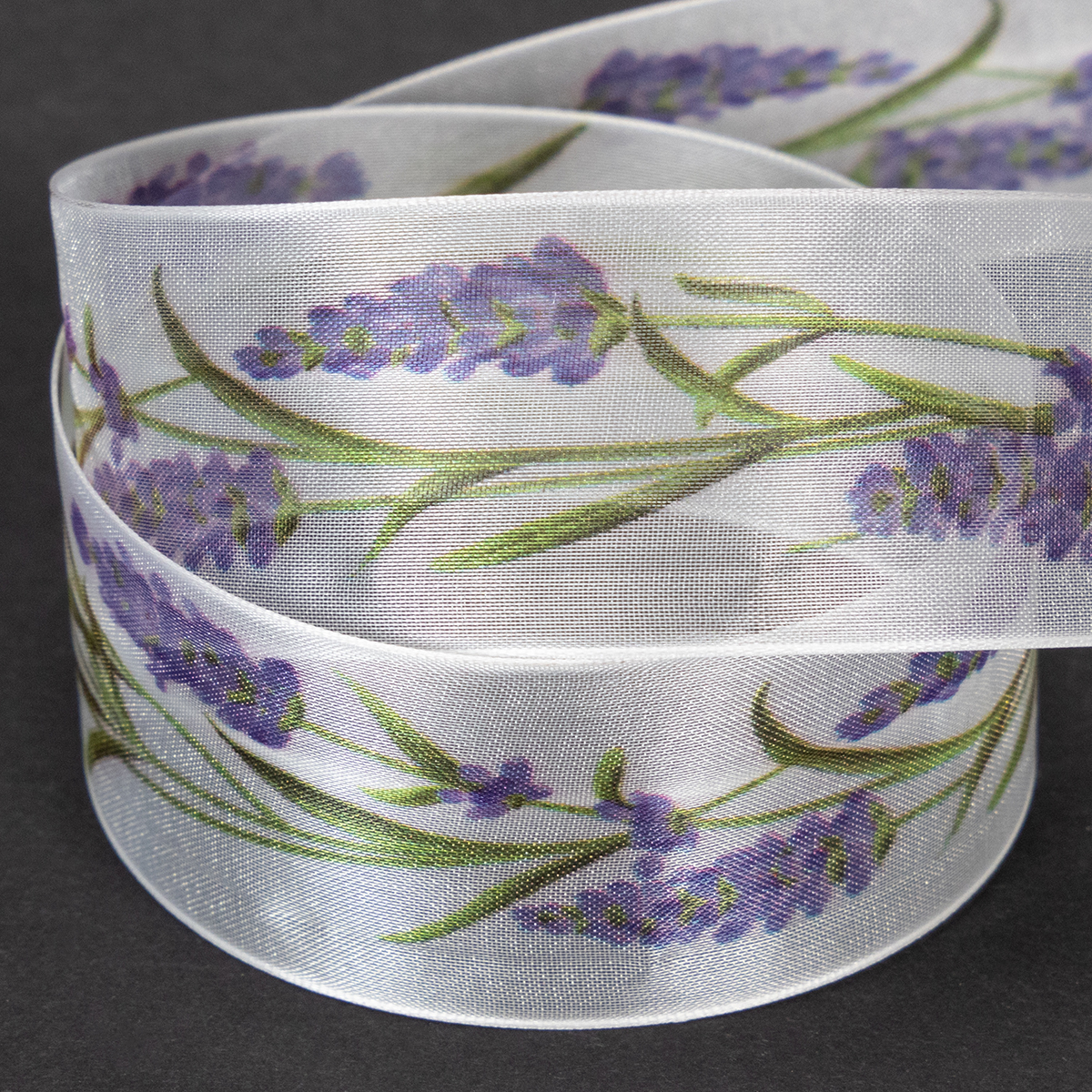Il motivo lavanda appare fresco e colorato sullo sfondo bianco del nastro di organza. Il nastro di chiffon con la sua trama in organza trasparente è leggero e ha una lucentezza caratteristica, mentre i bordi che mantengono la forma fanno sì che i fiocchi abbiano un aspetto pittoresco.