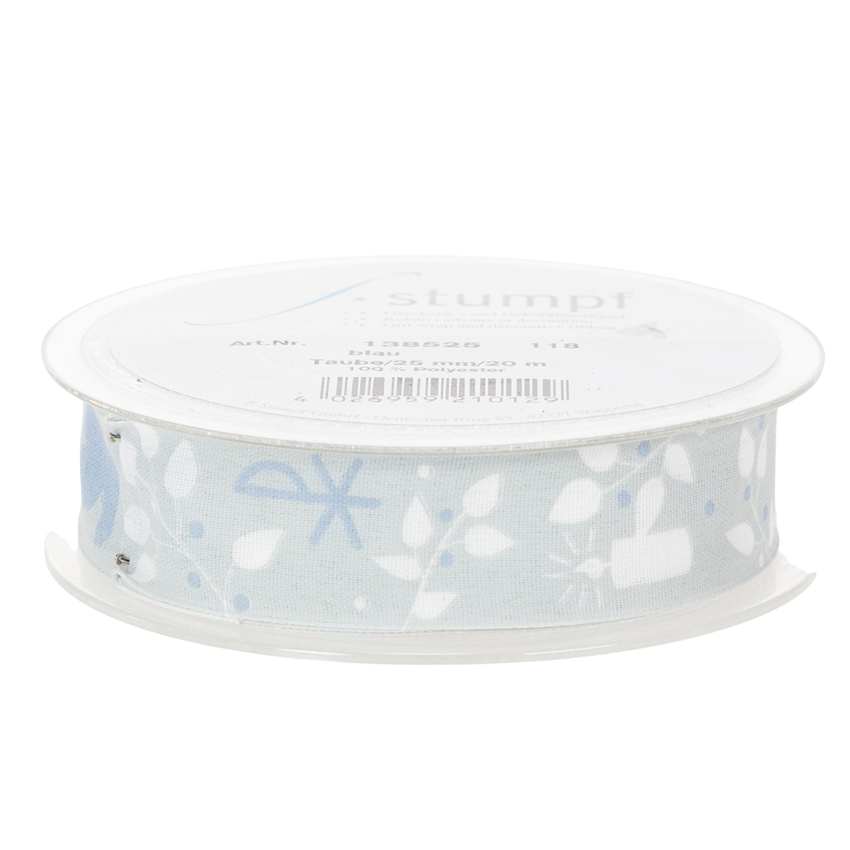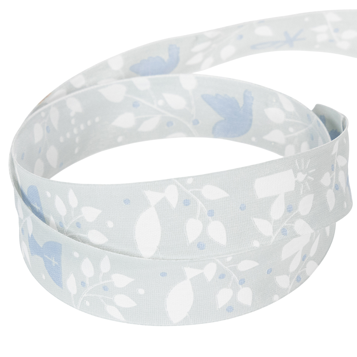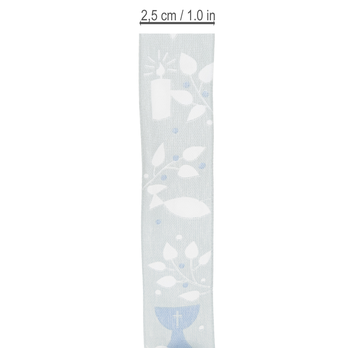La fascia in tessuto azzurro è stampata con simboli cristiani in bianco e blu scuro, che si riferiscono all'occasione religiosa e hanno un design meravigliosamente senza tempo. Poiché i motivi sono circondati da tralci di foglie, il nastro può essere facilmente incorporato nelle decorazioni floreali per la comunione. Una cimosa conferisce stabilità al nastro decorativo.