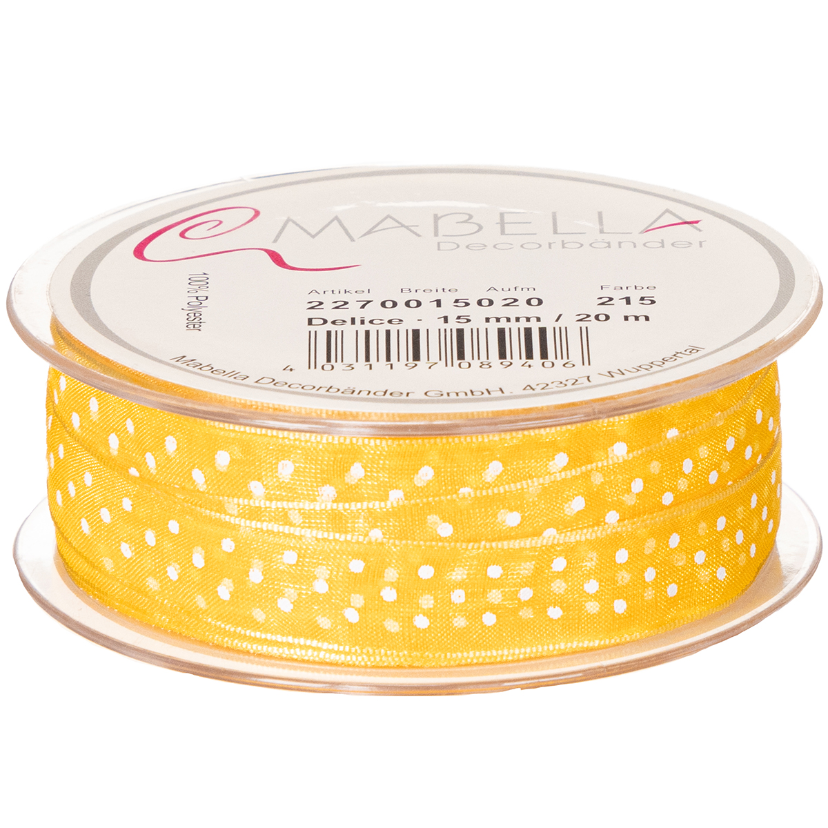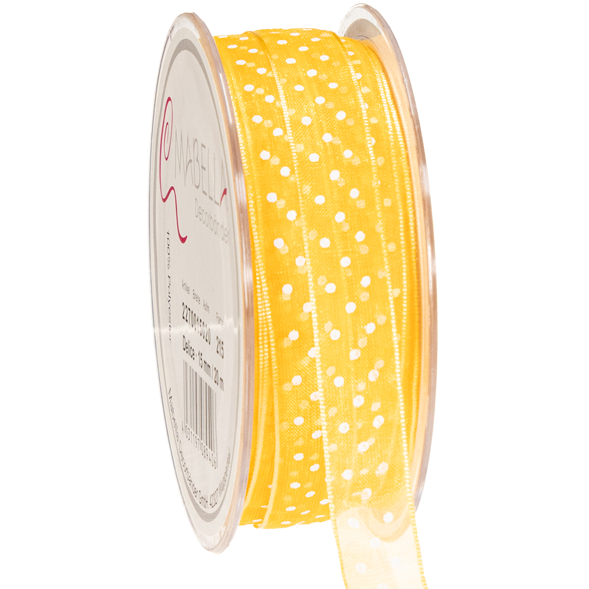Il nastro regalo giallo con i punti bianchi è realizzato al 100% in poliestere e misura circa 25 millimetri di larghezza e circa 20 metri di lunghezza. Lo ottieni su una piccola e pratica bobina di plastica, che puoi riporre comodamente in un cassetto o nel cestino da cucito.