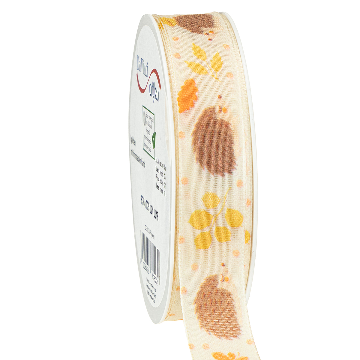 Il simpatico nastro regalo con il riccio è realizzato al 100% in poliestere ed è arrotolato su una bobina di plastica. Misura circa 15 millimetri di larghezza e circa 18 metri di lunghezza.