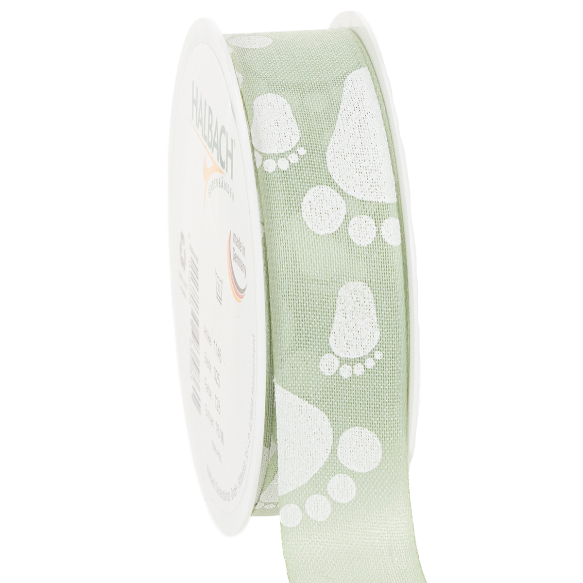 Il nastro regalo verde per il bambino delizia con graziosi piedini. Il nastro in stoffa è consigliato come dolce decorazione per battesimi e nascite.