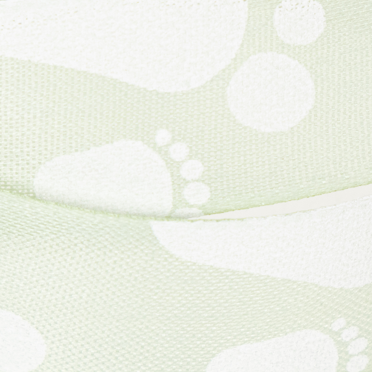 Lo sfondo verde chiaro e pastello del nastro in tessuto è decorato con impronte piccole e grandi. In bianco, i piedini del bambino creano un bellissimo contrasto con il colore del nastro decorativo e catturano abilmente il tema del lieto evento.