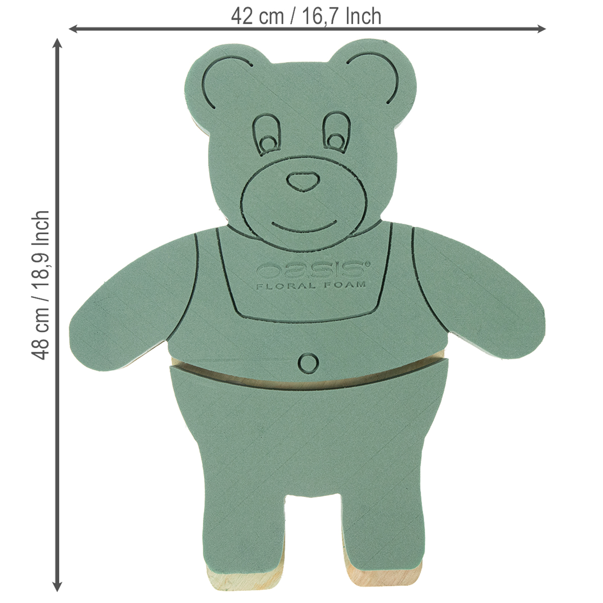 La figura di muschio di bastone Oasis® a forma di orsacchiotto viene consegnata in una grande scatola. L'orso spugna per fiori misura circa 48,5 centimetri per 42 centimetri. È alto circa 5 centimetri.