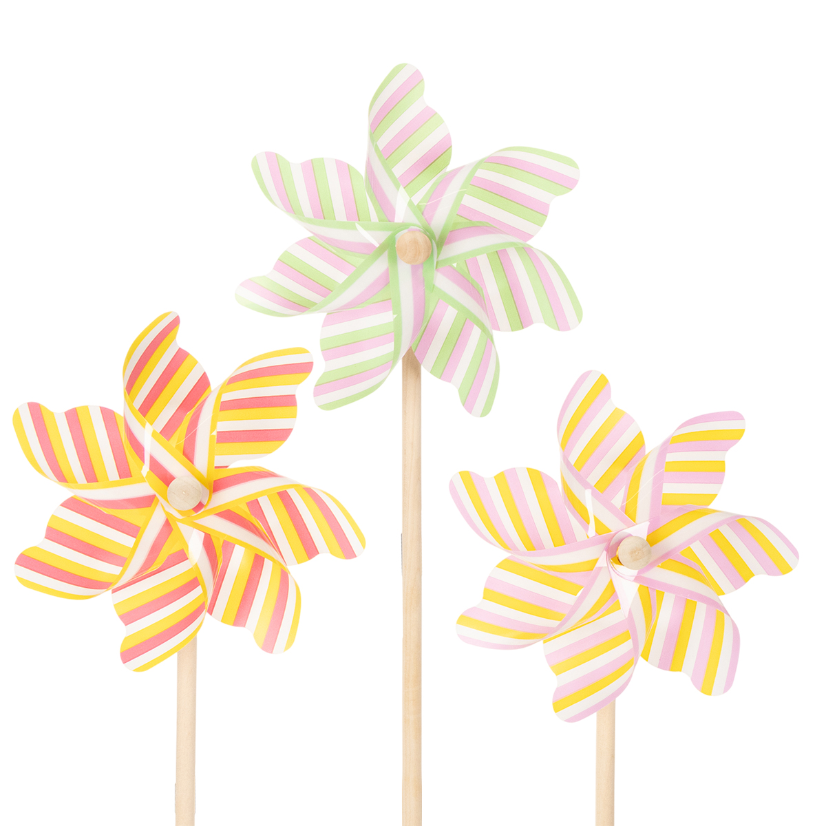 - Set composto da 3 mulini a vento a righe in delicati colori pastello