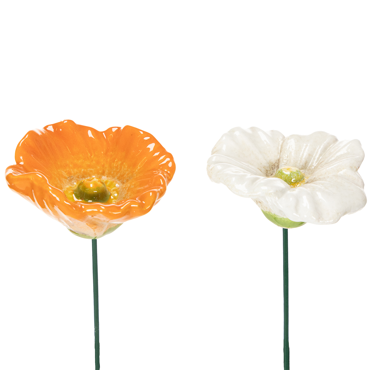 Questi sostegni da giardino a forma di papavero combinano un'estetica elegante con materiali durevoli e di alta qualità. Con un'altezza di 32 cm e un diametro del fiore di circa 6 cm, sono l'aggiunta perfetta a qualsiasi spazio esterno. I vivaci colori arancione e bianco sono armoniosamente coordinati e apprezzati in tutto il mondo per il loro significato simbolico: l'arancione rappresenta energia e calore, mentre il bianco incarna pura eleganza e speranza. Il robusto sostegno in metallo garantisce la stabilità del fiore in ceramica anche in caso di vento leggero. Che si tratti di un classico giardino di campagna o di un fresco tocco in un moderno giardino urbano, questi sostegni si integrano perfettamente in qualsiasi stile.