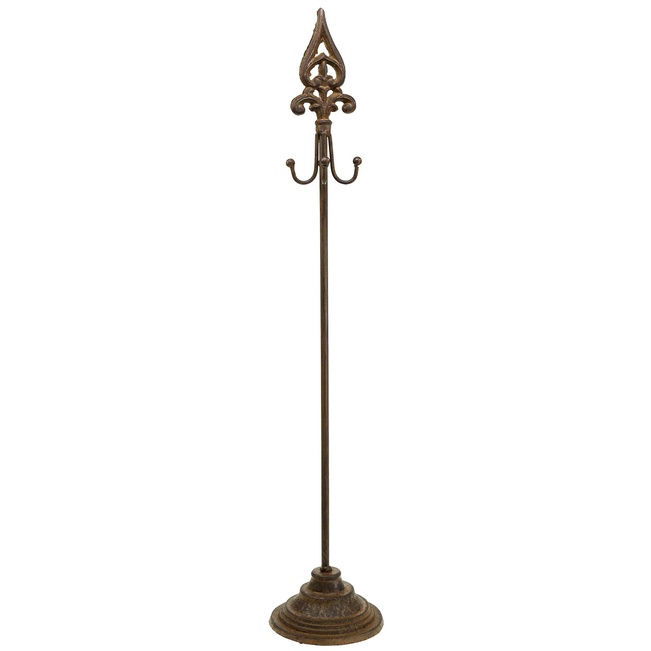 Il caratteristico stand della corona sembra una scoperta dei tempi antichi. Lo stand è stato abilmente realizzato in ferro e dotato di un'elegante patina antica. Nella parte superiore è un elemento decorativo di un Fleur-de-Lily, che è anche chiamato giglio francese, in quanto era il simbolo della monarchia francese. Ci sono quattro ganci attaccati ai quali puoi attaccare ghirlande e decorazioni.