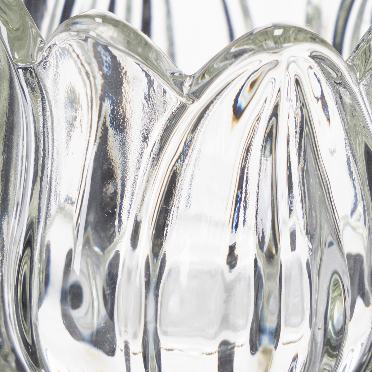 Questo portacandele combina sapientemente un'eleganza senza tempo con una pratica funzionalità. Realizzato in vetro trasparente di alta qualità, colpisce sia per la sua struttura robusta che per il suo sofisticato design a forma di fiore. La superficie trasparente mette in risalto la delicata forma floreale, rendendolo un elemento decorativo non solo come fonte di luce, ma anche quando è vuoto.