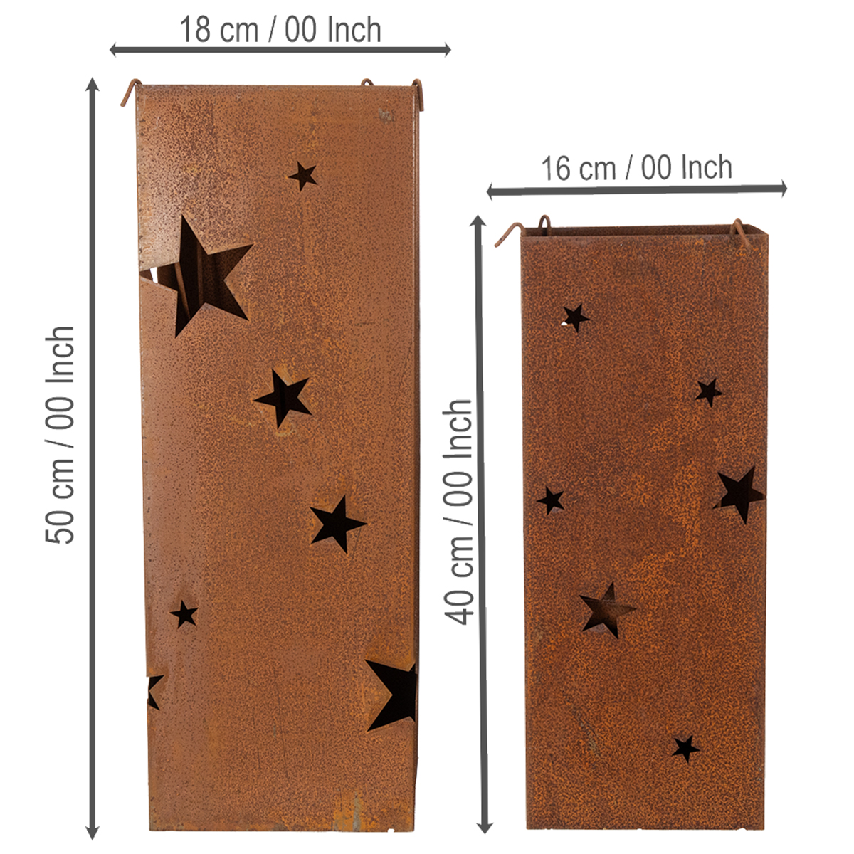 Questi portacandele sono disponibili in un set di due con un'altezza di 50 centimetri e 40 centimetri. Fai brillare il tuo balcone o terrazzo con le stelle nella decorazione patinata.