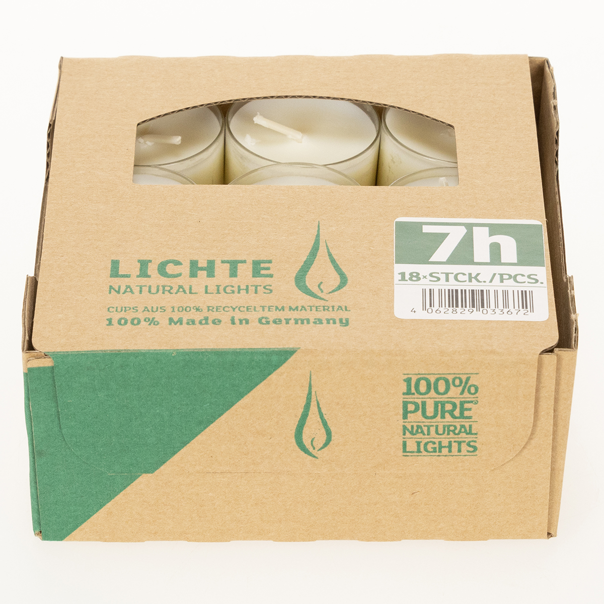Nome del prodotto: PURE Nature Lights Lumini Cera di colza naturale Tempo di combustione 7 ore 18 pezzi