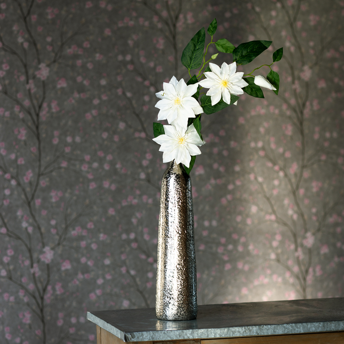 La notevole lunghezza di 81 cm offre la libertà di disporre il ramo in vasi sia alti che bassi. Un vaso da terra o da tavolo diventerà immediatamente un punto focale. Il ramo di clematide è particolarmente adatto ad ambienti luminosi e ariosi o come elemento decorativo per tavoli nuziali, aree di ricevimento o eleganti allestimenti per uffici. Se lo si desidera, può anche essere abbinato ad altri fiori decorativi trasparenti o bianchi per creare una composizione floreale unica. Ad esempio, che ne dite di aggiungere un tocco vintage presentando il ramo in contenitori rustici?