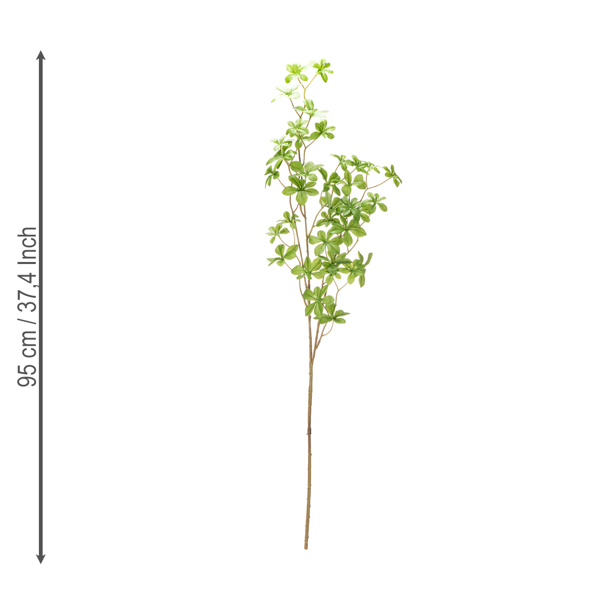 Con i suoi 95 cm di altezza, questo ramo artificiale di pianta d'appartamento è un vero e proprio colpo d'occhio, sia esposto singolarmente in un semplice vaso che come parte di una composizione più ampia. Le delicate tonalità verdi delle foglie trasmettono una freschezza naturale che rivitalizza all'istante qualsiasi ambiente. Ideale per l'arredamento del soggiorno, ma anche un'elegante aggiunta a uffici e vetrine. Chiunque cerchi un design moderno con un tocco di giungla urbana adorerà questo ramo artificiale.