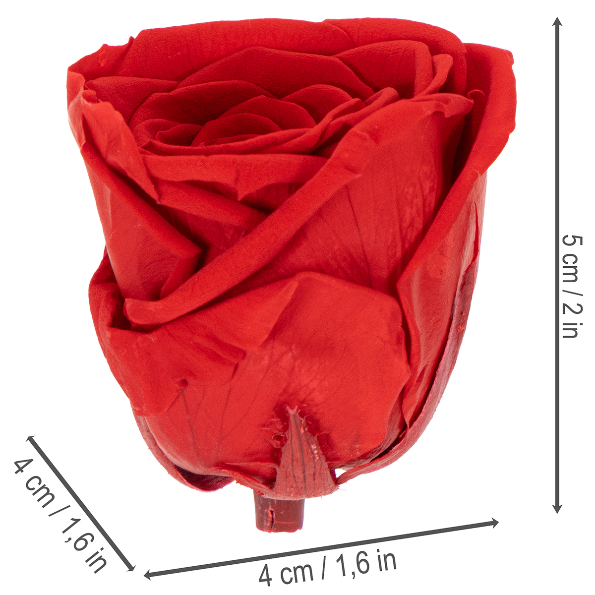 Le nostre rose stabilizzate colpiscono per il loro colore rosso brillante e la lavorazione di alta qualità. Ogni rosa viene accuratamente selezionata e stabilizzata con un processo speciale. Questo garantisce che la consistenza e l'aspetto naturali del fiore vengano mantenuti, come se fosse appena colto. Con un'altezza di circa 5 cm e un diametro di 4 cm, le rose sono perfettamente proporzionate per aggiungere un tocco di eleganza a qualsiasi decorazione.