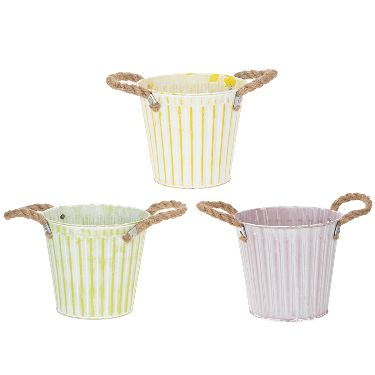 Secchio per piantare, fioriera con manici, decorazione in metallo rosa/verde/giallo shabby chic Ø16,5cm H15cm set da 3 pezzi