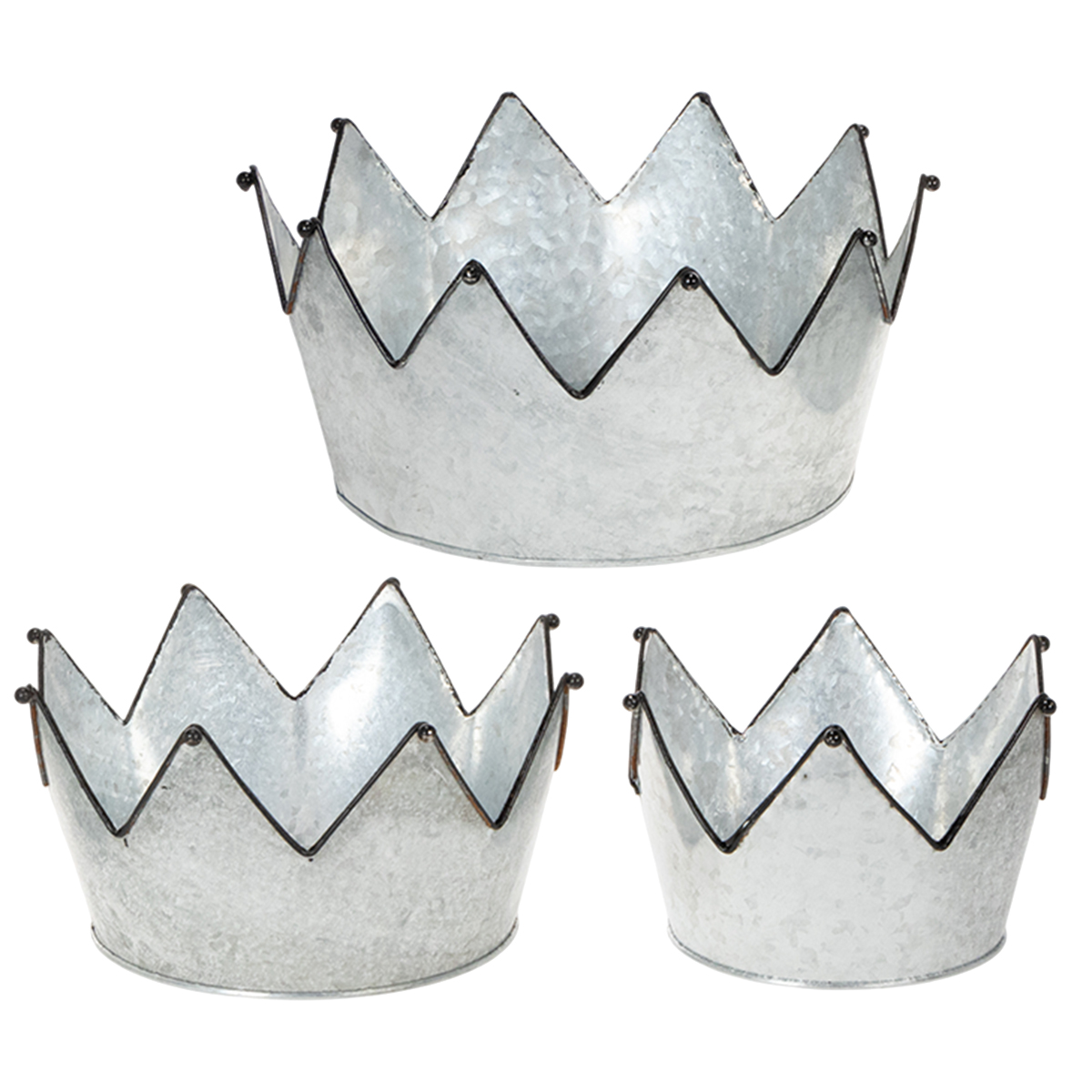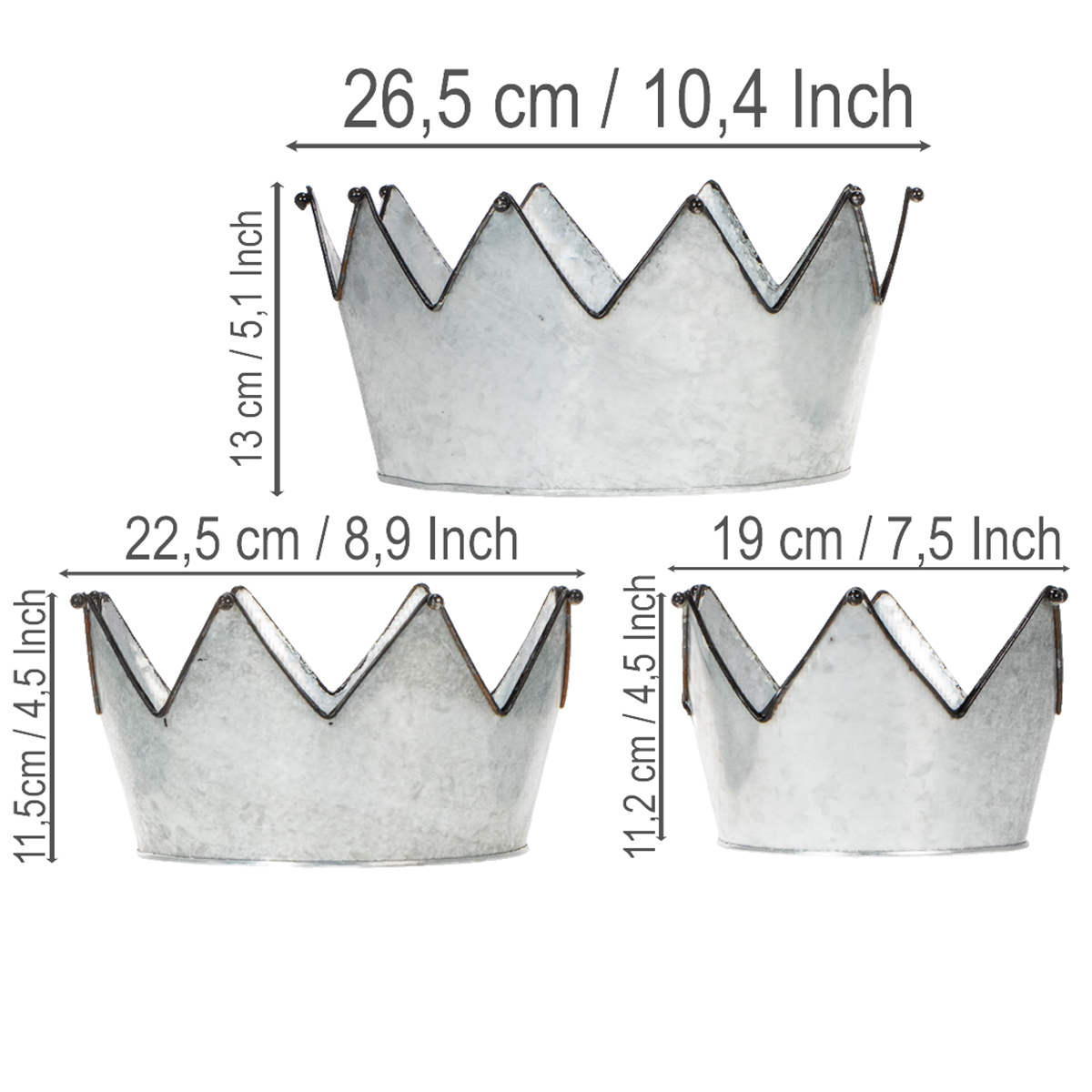 Le tre ciotole di metallo in zinco sono realizzate in diverse dimensioni. Ciò che hanno in comune è il bordo nero attorno alle punte, che sono decorate con una pallina ornamentale. La palla è anche nera per abbinarsi alla decorazione vintage. Il bordo nero con decorazione lo rende chiaro a tutti: qui ci sono tre corone, pronte per essere riempite o semplicemente per essere posizionate.
