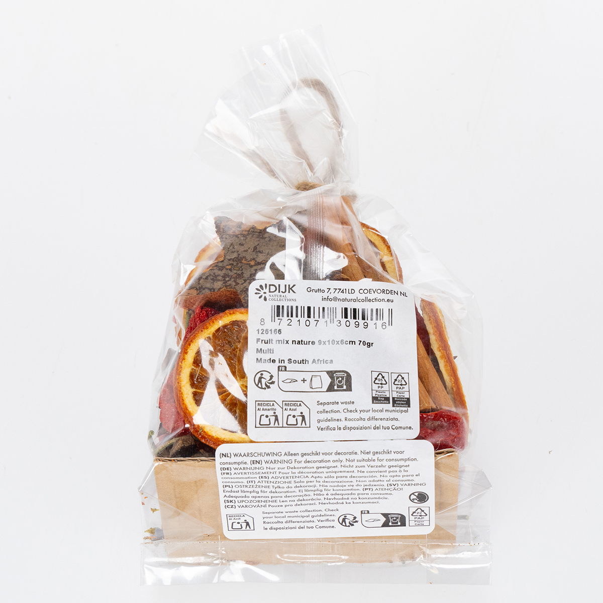 - Contenuto: fette di arancia essiccate, stecche di cannella, anice stellato, stelle di legno, peperoni rossi ornamentali