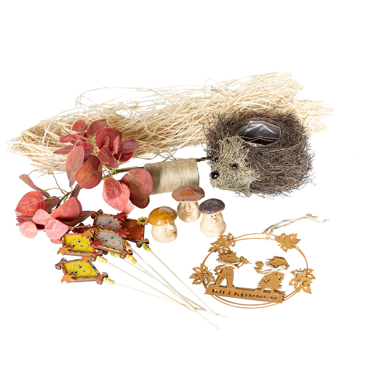 Il nostro set di decorazioni autunnali combina tutto il necessario per creare un'atmosfera autunnale. Questo grazioso riccio fatto di viticci attirerà l'attenzione in ambienti rustici e accoglienti, perfetto per uno stile country. È completato da funghi in miniatura nei toni caldi del marrone, del beige e del rosso ruggine, oltre a divertenti stecchini per fiori, pratico spago di iuta, realistiche foglie autunnali rosse come piante artificiali e un cartello di benvenuto color ruggine.